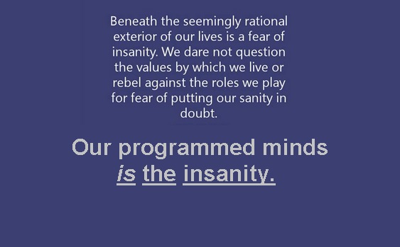 Finding you own sanity only reveals to you the insanity you are now immersed in, the insanity of your environment, of all those around you – filled with people who have not wiped the slate clean, but instead continue to use their own irrationally as the template of their lives.