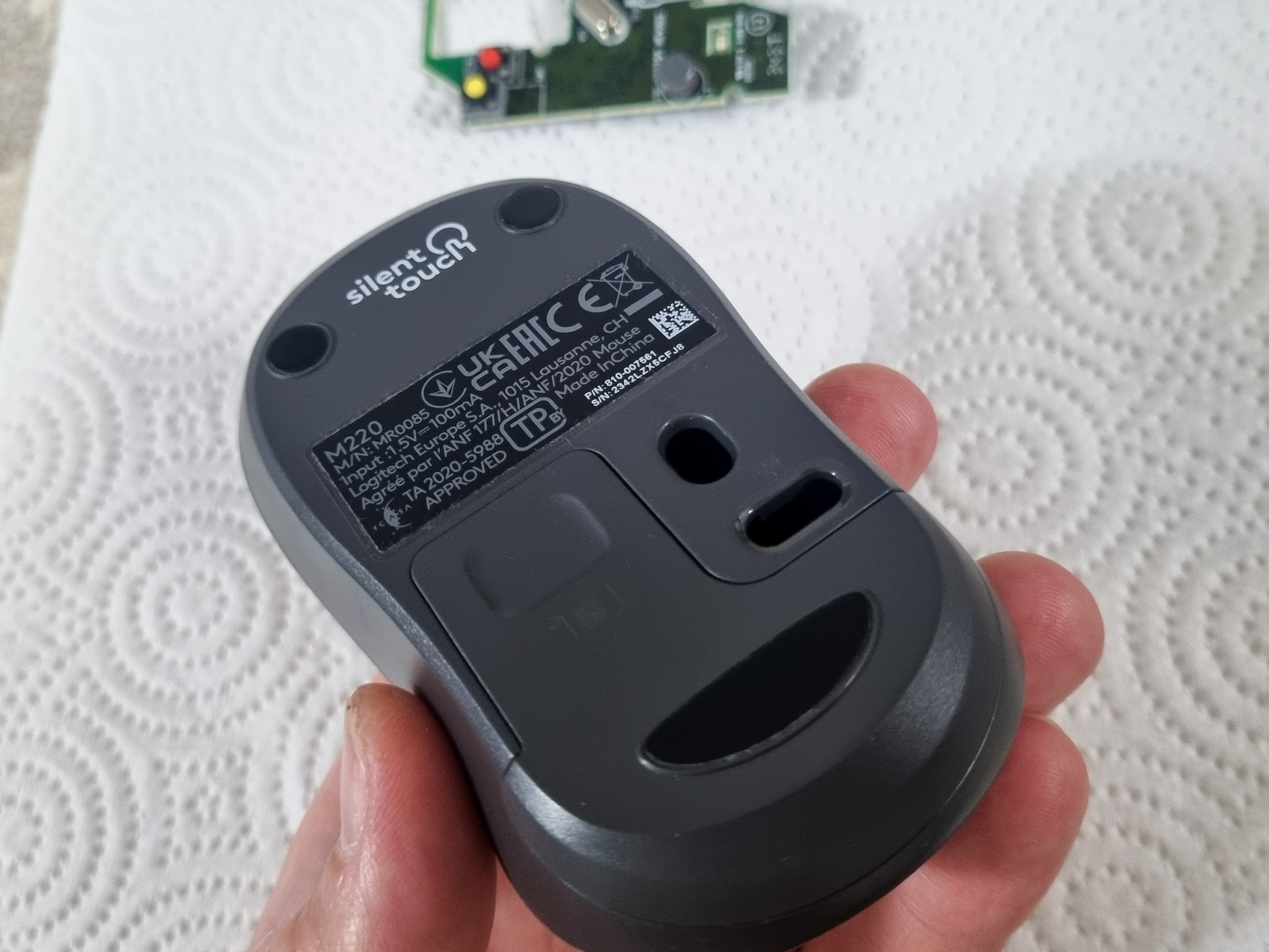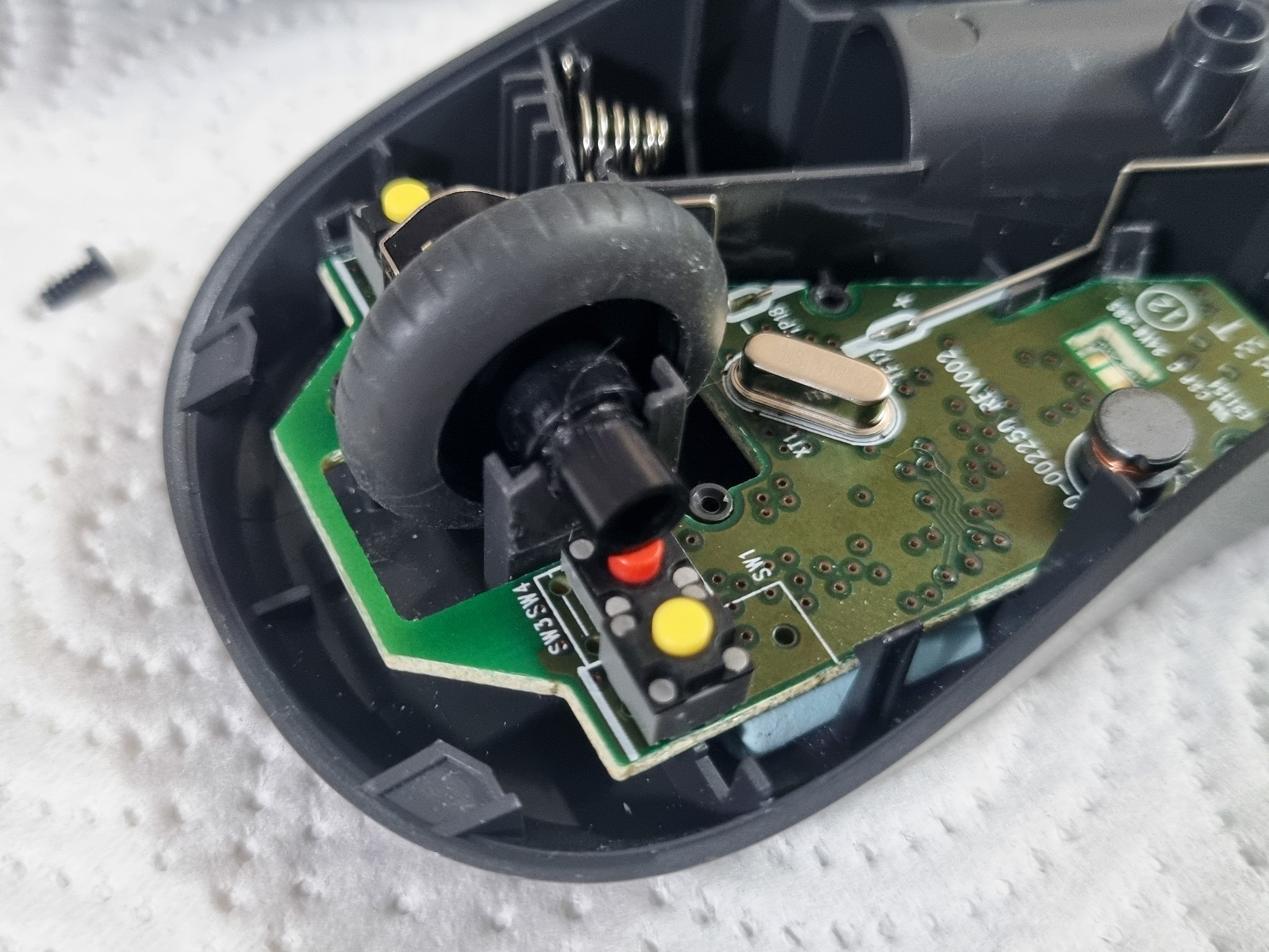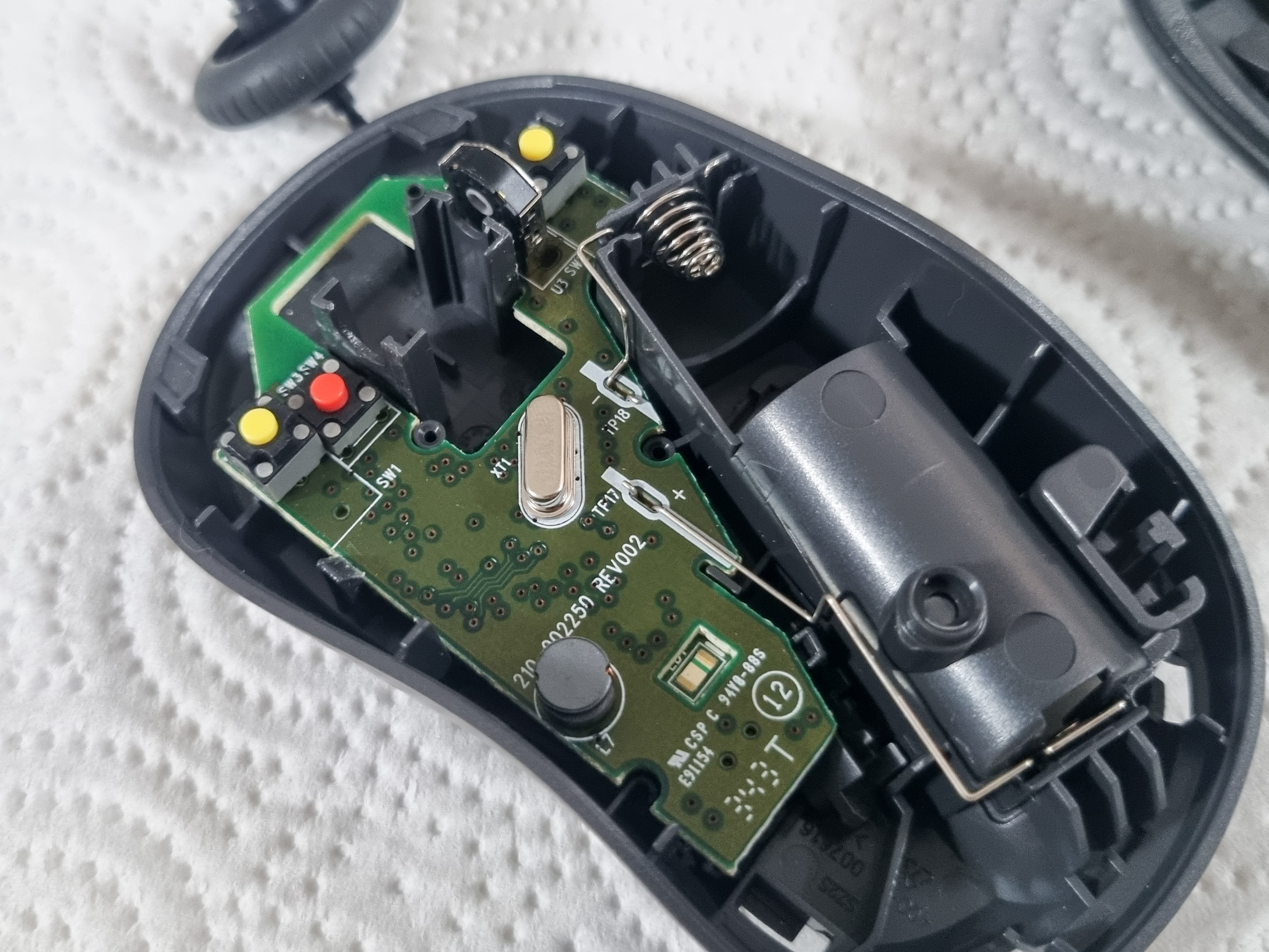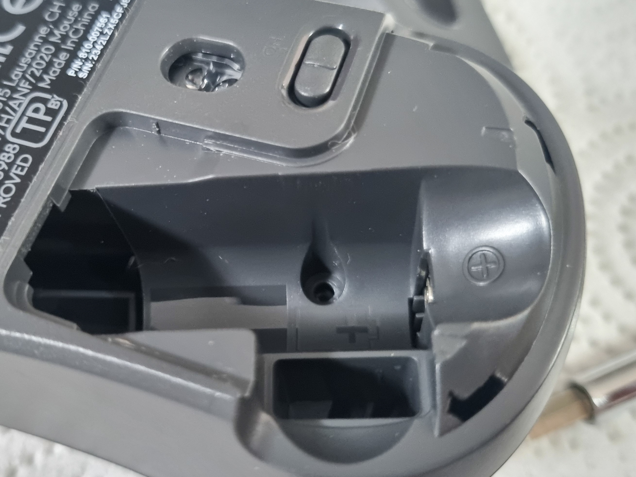 To begin with, I decided to just take the device apart to assess the prospects and possibilities. The body of the computer mouse was held together by a small screw hidden in the battery compartment under the sliding cover.
