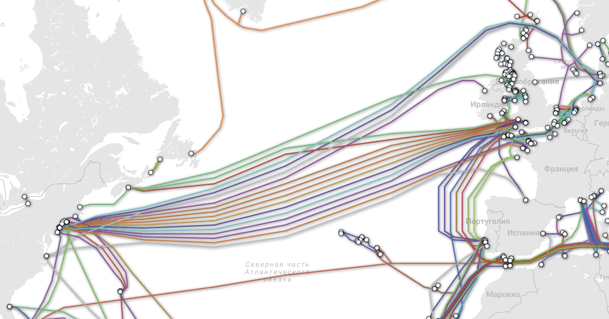 The ocean is permeated with fiber-optic wires that lie on the bottom and connect the continents, and the most important part of traffic is transmitted through them. There is a detailed diagram describing each cable. There is actually an online service. Interactive map of all fiber optic cables.
