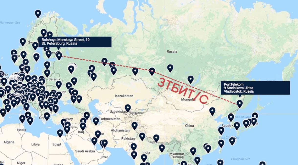 From St. Petersburg to Vladivostok for example.
