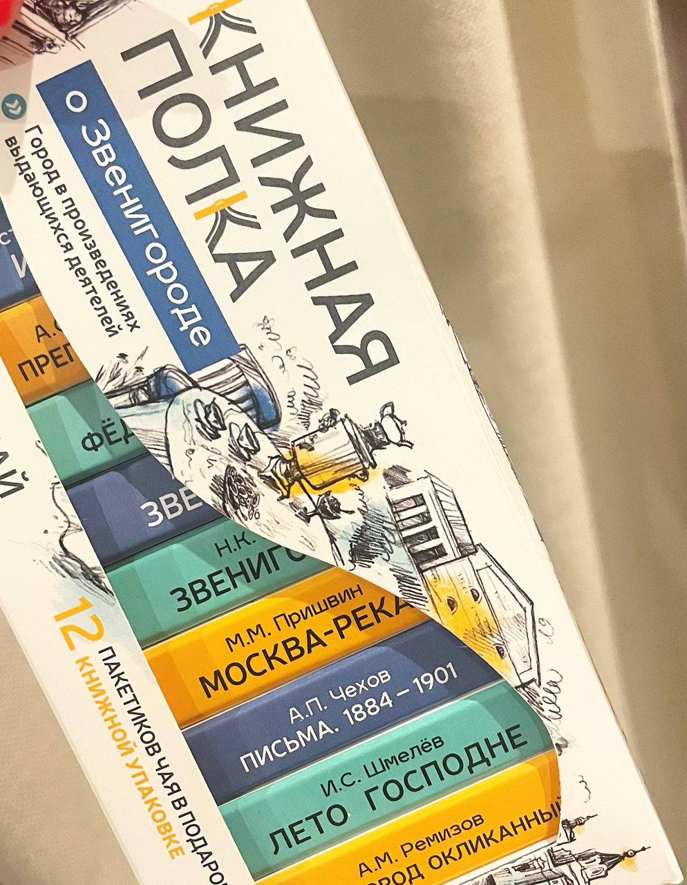 Я же вам не рассказала про небольшой сувенир, что привезла из нашей поездки в Звенигород. В местном магазинчике купила вот такой набор чая «Книжная полка». Я видела их ещё в питерском Доме Зингера. Но тогда было много суеты, не вникла. А тут решила поизучать.