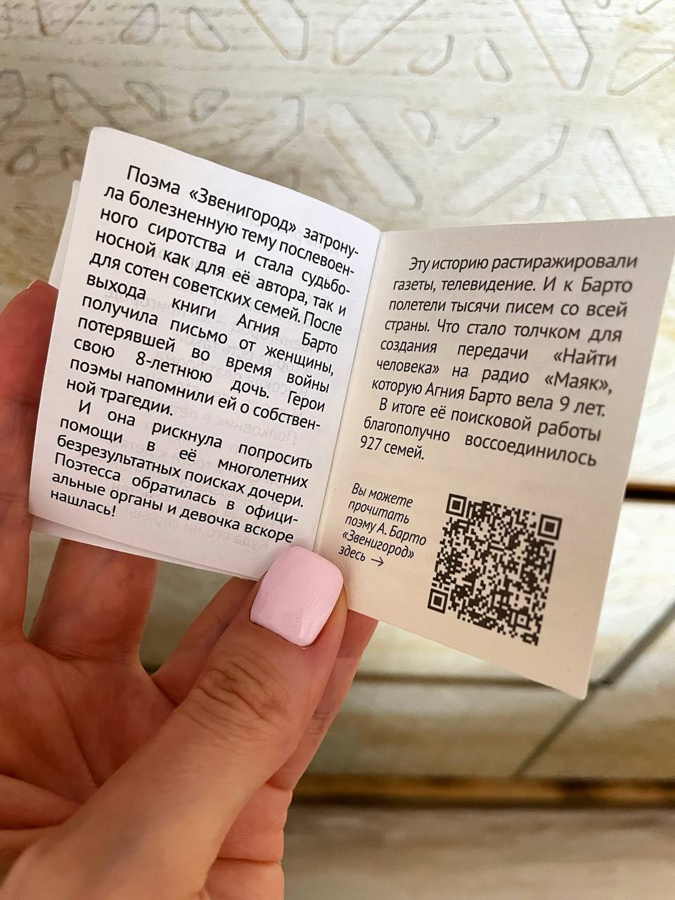 Например, я никогда не знала связи Агнии Барто, Звенигорода и передачи «Найти человека»! Оказывается, после Великой Отечественной войны известная писательница побывала в детском доме Звенигорода. В доме, где воспитывали детей-сирот, тех, у которых родители погибли или пропали во время войны. После этой поездки Барто написала поэму «Звенигород». Она затронула болезненную тему послевоенного сиротства: