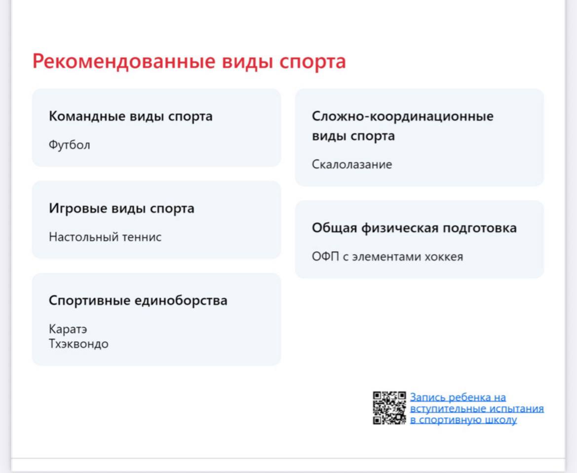 Тестирование включает более 100 параметров, охватывающих двигательную активность, психическое и физическое здоровье ребёнка. По итогам выдают список рекомендуемых направлений и обоснование выбора.