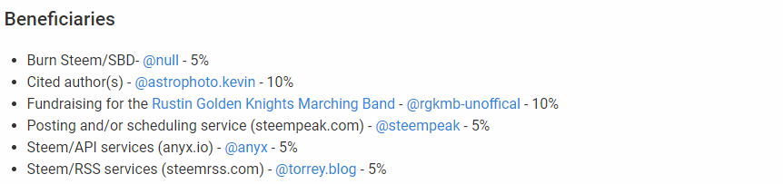 If you post through @steempeak (steempeak.com), you have an option to set one or more beneficiaries for your post. So, using that feature, you can create your own collaboration rewards, as I did in the "Cited author(s)" line from above. In that post, I included information and a photo from one of @astrophoto.kevin's posts, so I asked the blockchain to send 10% of the author's reward share to that account. When the post pays out, that amount will never even touch my wallet. I have been doing this - including posts from other Steem authors, and setting beneficiary rewards for them - just about every day since April or May.