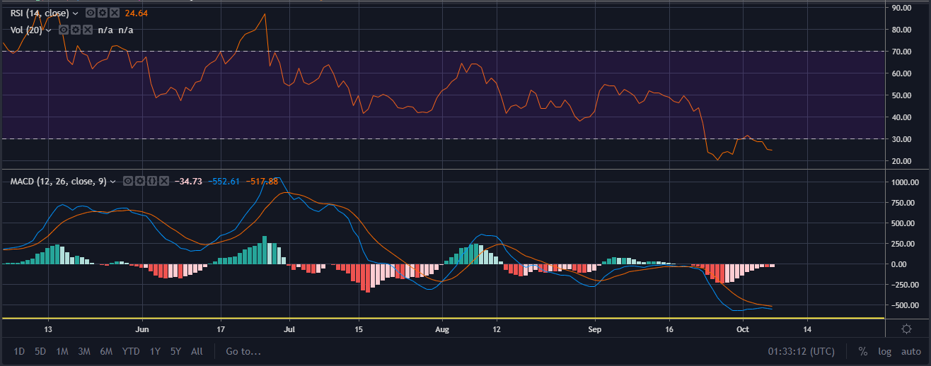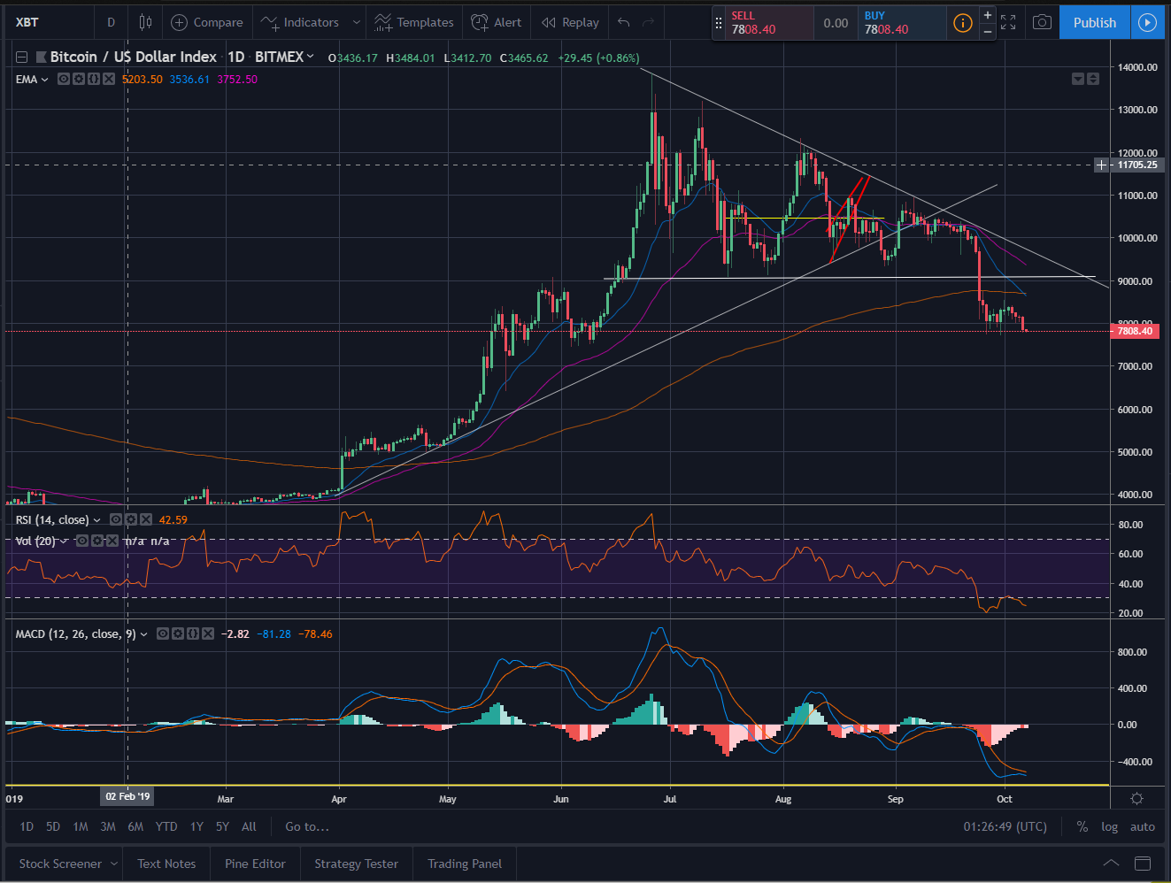 2.Indicators like RSI and MACD are very close to all time lows since almost a year ago, November 2018; not saying that this is the bottom but whenever this two lagging indicators are so low a bounce is ready to start, this is my current stand and I have a long position on Bitmex, almost everyone is short but my opinion is that this is not the time to short, the time to short was a month ago back, coinfarm.online showing a 76.45% short positions currently at the moment of this post but why short now when most indicators show a possible bounce back to 9k