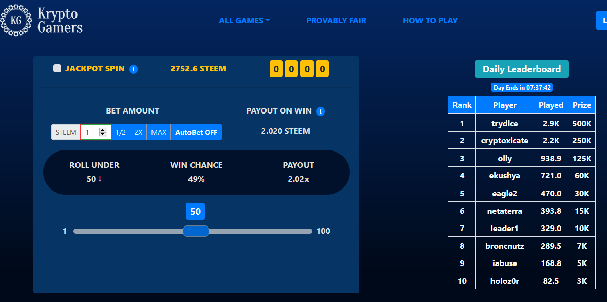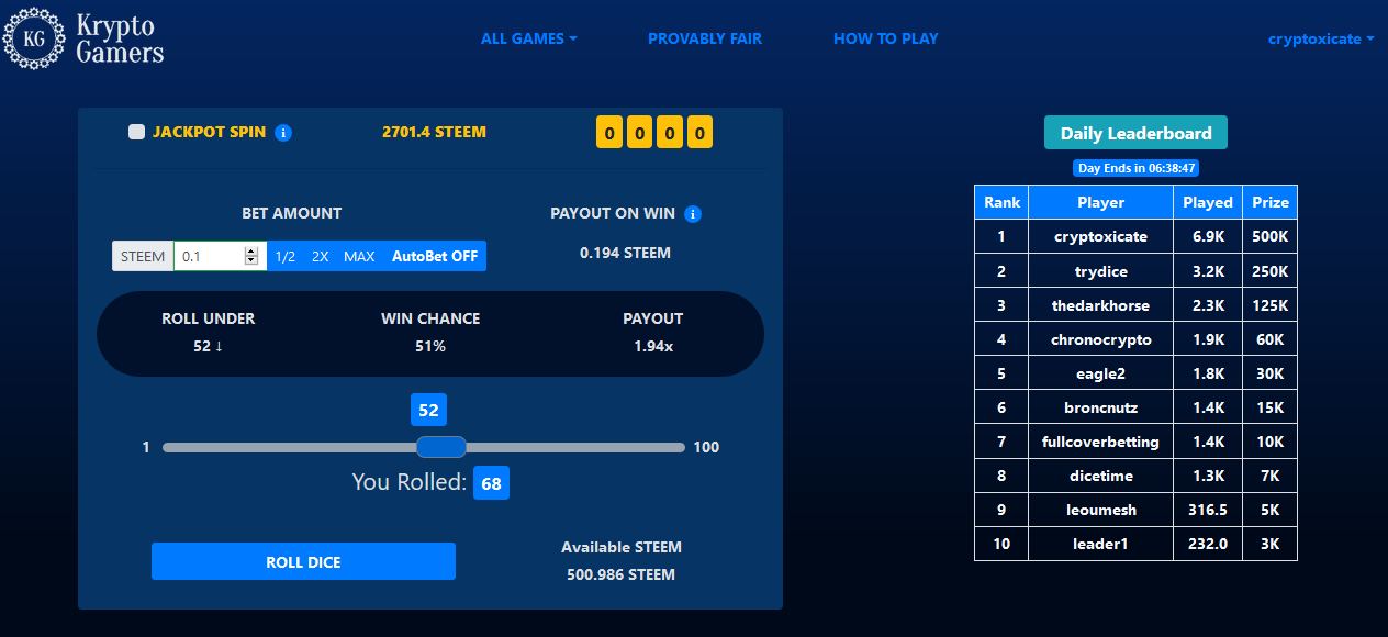 Im still rolling the dice generating more STEEM every day, I still support the platform and now Im wagering more than before trying to keep up with the rest of the leaderboard, I haven't sold my tokens yet Im still waiting for them to unstake but also I can see that the price has decrease a bit, not many buyers neither so I'll keep you posted once I unstake my tokens what will be my decision and why, also Kryptogamers is suppose to come up with a website refresh a new look but nothing concrete yet, no sneak peak or pictures to show , the purpose of this and all my posts are just to document my journey on crypto