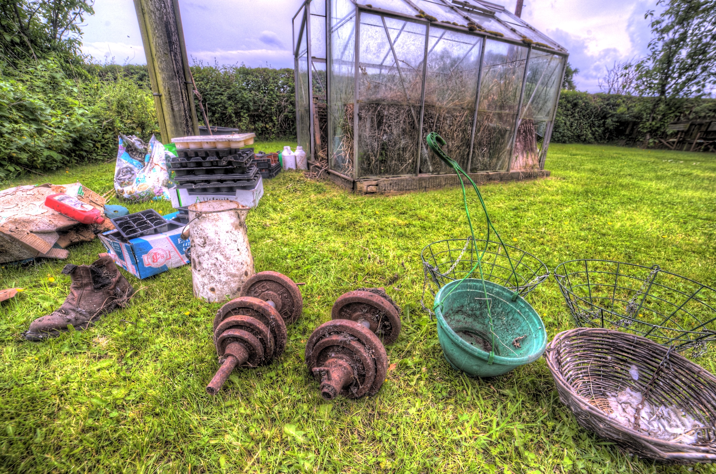 In cleaning through the greenhouse junk I came across a number of things including an old boot, a milk pail, some hanging baskets and a very rusty dumbbell set.