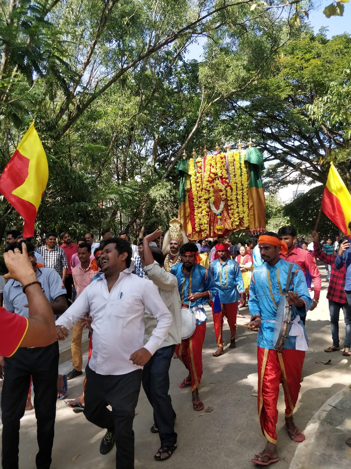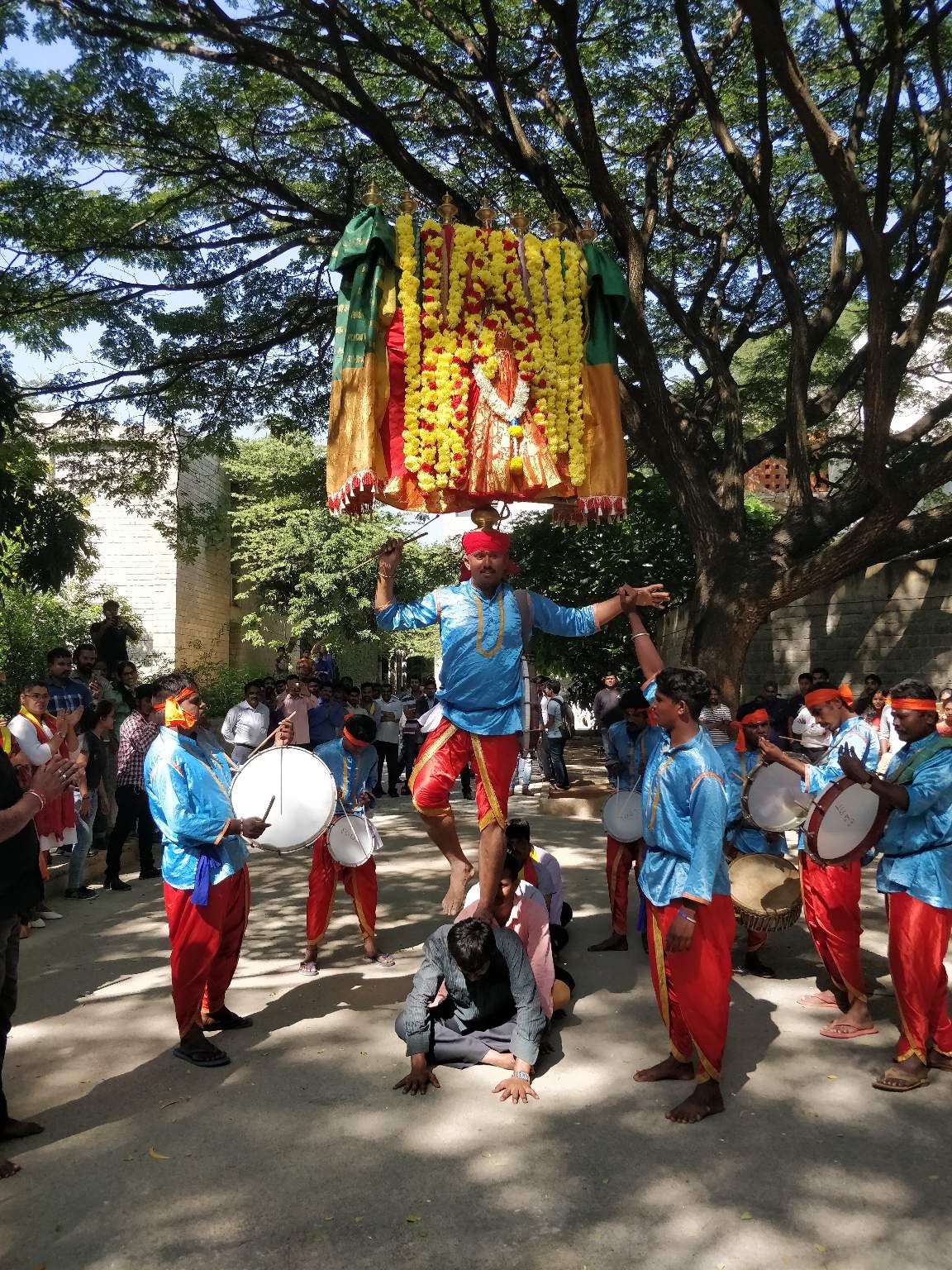 The Campus hosts lots of cultural events. This is one of the traditional dance and procession called Dolly Kunita (Kannada Language) meaning dancing with the Drum.. A group of drumers play music and a performer with huge Doddess Durga's idol on his head dances and performs stunts!