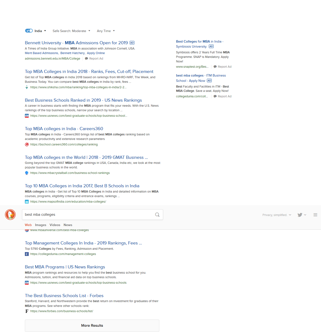 Similarly you type' Best mba colleges' and this is what the search engine displays to you: