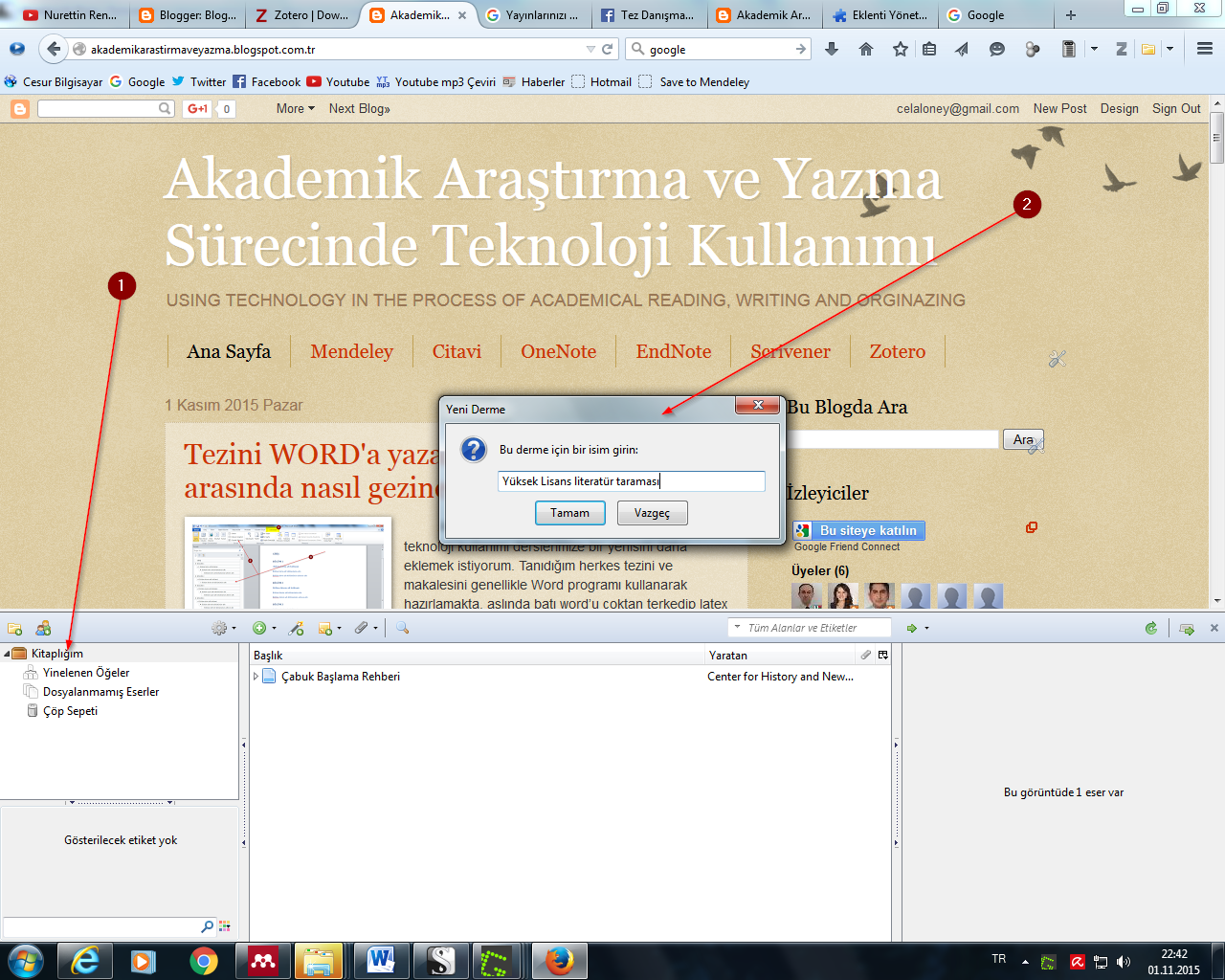 B ugün Google’ın sunduğu akademik tarama hizmeti Google Scholar başta olmak üzere üniversitelerin açık arşivleri/kütüphaneleri ile kamu kurum ve kuruluşlarında, başbakanlık arşivleri ve daha bir çok yerli yabancı kaynak arşivleri araştırarak..Burada bulduğunuz kaynakları nasıl toplanır? Hepsini bir yere toplandı neye göre guruplandırma yapılacak? Bu kaynakların künyeleri ve türleri nasıl bir veritabanına girilecek? Bu veritabanını kolay yönetebilecek miyim? Örrneğin bir kitap satış sitesinden aradığım kaynaklara rastladım bunları literatür tarama sırasında oluşturduğum biblografya ya nasıl ekleyeceğim.Bunların hepsini düzenleyen bir program değil üstelik,eklentinin ismi Zotero, Mozilla tarayıcıya ekleniyor, böylece ademik yayınlar kolaylıkla taranabilmektedir.