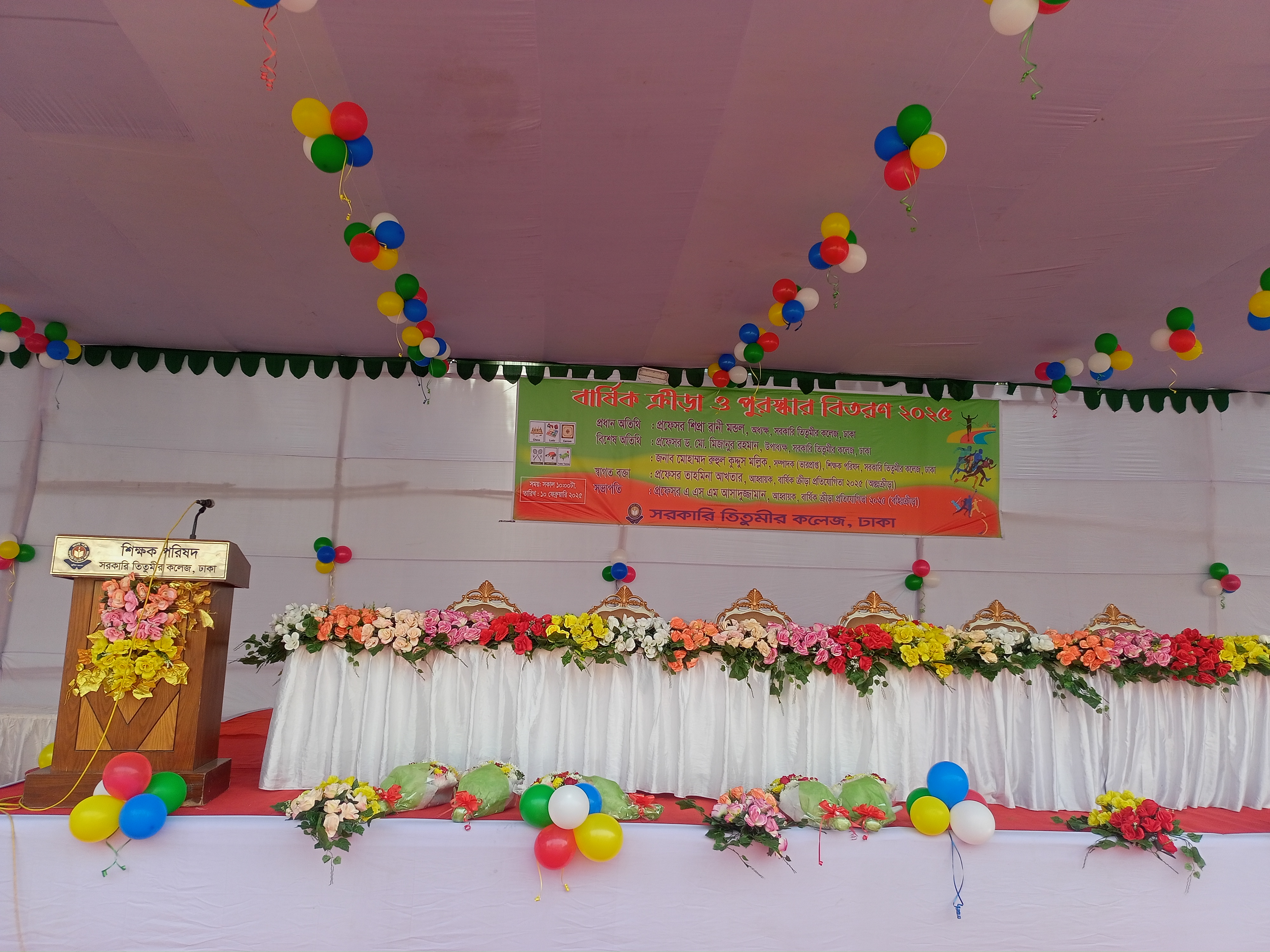 সরকারি তিতুমীর কলেজর এর উদ্যোগে আয়োজিত ক্রীড়া প্রতিযোগিতার সমাপ্তি পর্বে পুরস্কার বিতরণের জন্য প্রস্তুতি চলছে। দীর্ঘদিন ধরে চলা এই প্রতিযোগিতায় বিভিন্ন ক্রীড়া ইভেন্টে অংশগ্রহণকারী প্রতিযোগীদের পুরস্কৃত করার আয়োজন করা হয়েছে।