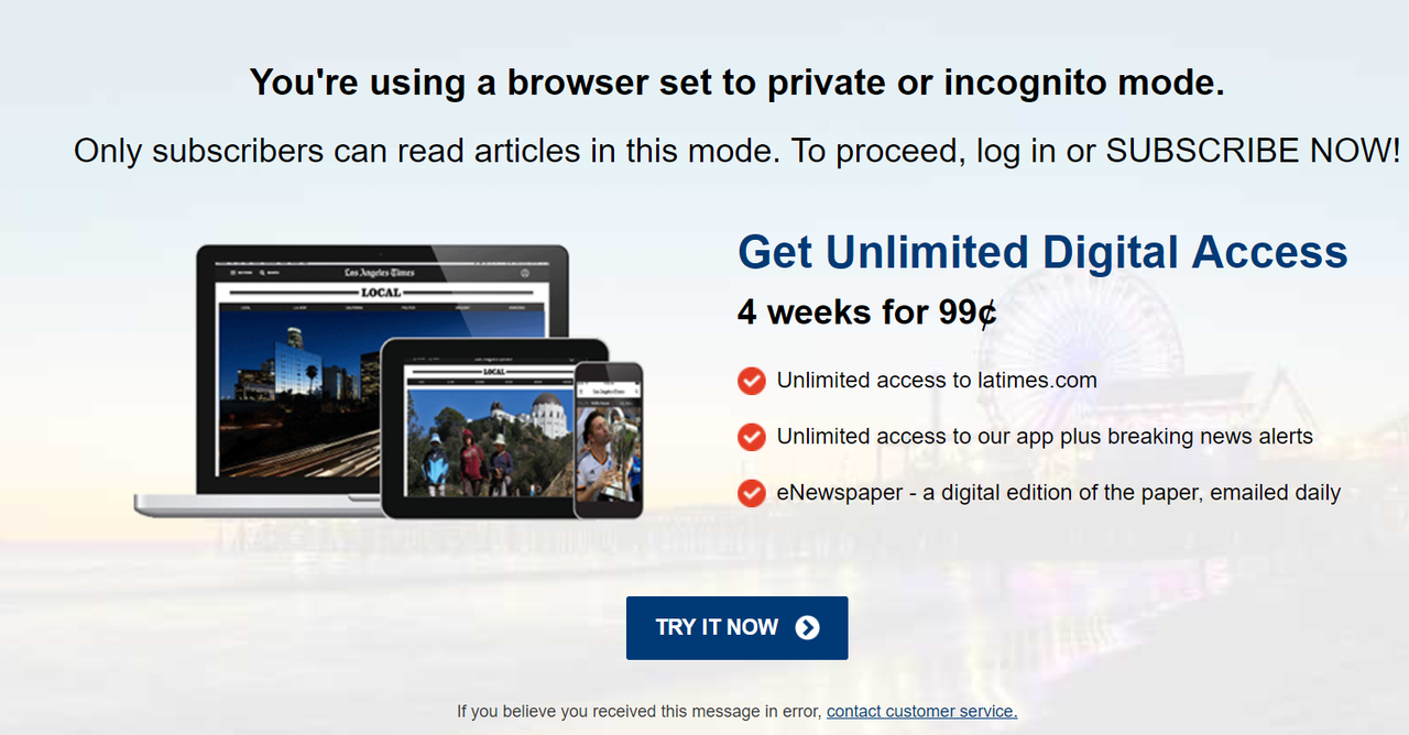 This is what I got when I tried to read of articles from The Los Angeles Times: