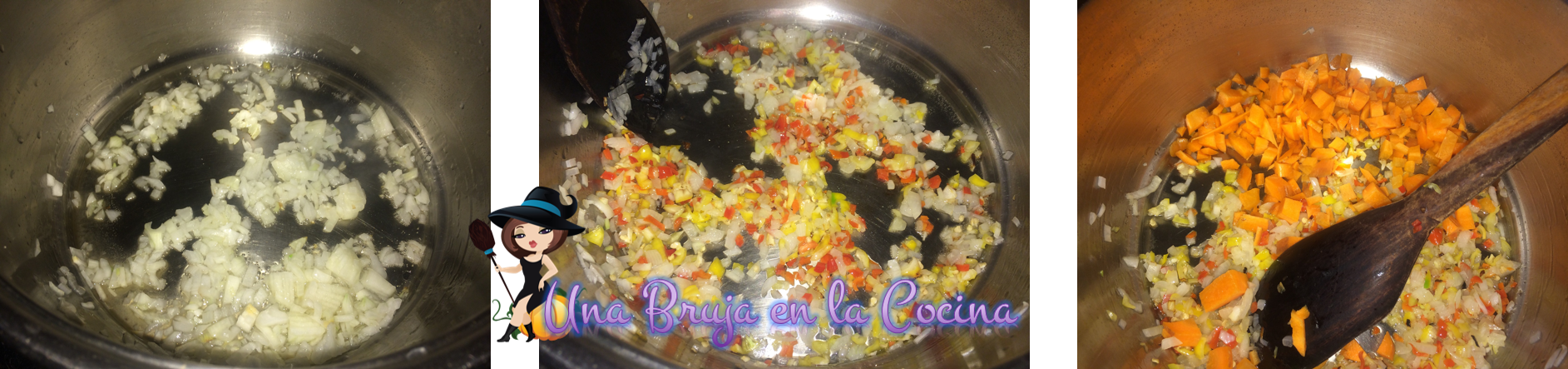 En una olla grande agregamos un par de cucharadas de aceite vegetal, y freímos nuestra cebolla hasta cristalizar, para luego agregar el ají y saltear un par de minutos, continuamos agregando la zanahoria y salteamos por otro par de minutos más.