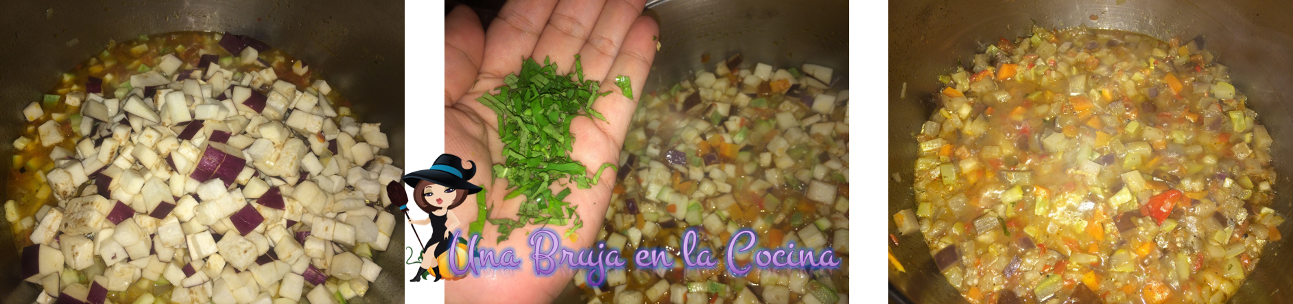 Pasados estos 5 minutos podemos notar que nuestra preparación tiene mayor cantidad de líquido, agregamos la berenjena y revolvemos, en este punto agregamos la sal, pimienta y comino, si lo desean pueden subir el fuego, para que se consuma buena parte del líquido ya que la berenjena también largara algo de sus jugos. Agregamos la albahaca picada revolvemos de nuevo y tapamos para dejar cocer por unos 10 minutos más hasta que esté listo nuestro guiso.