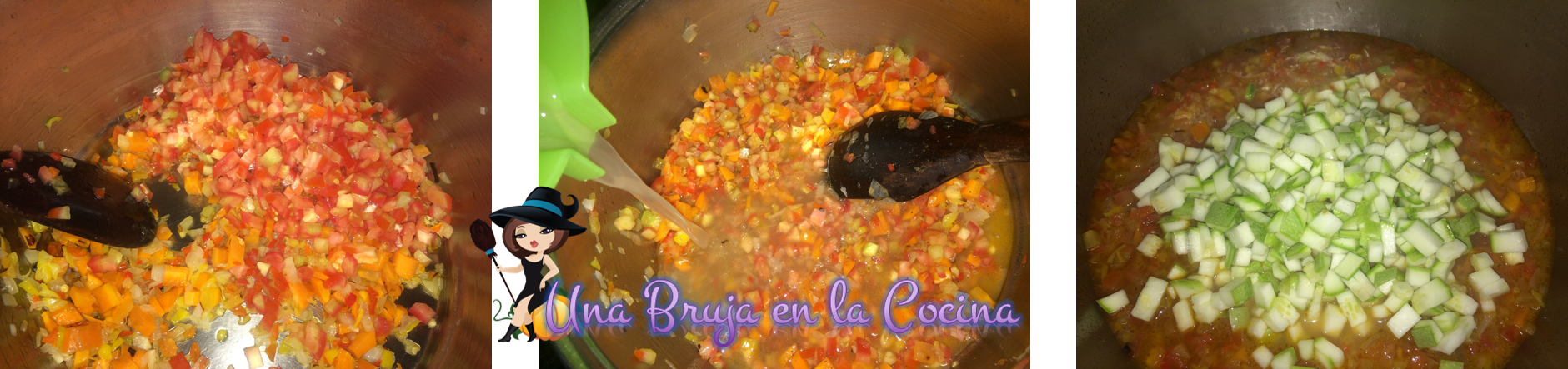 Agregamos los tomates finamente picados, de preferencia que estén bien maduros, revolvemos un poco y agregamos en este punto un poquito de la sal, agregamos el caldo de pollo y tapamos para dejar cocer por unos 5 minutos. Luego de este tiempo agregamos el calabacín, revolvemos, tapamos y bajamos el fuego a la mitad para dejar cocer por otros 5 minutos más.