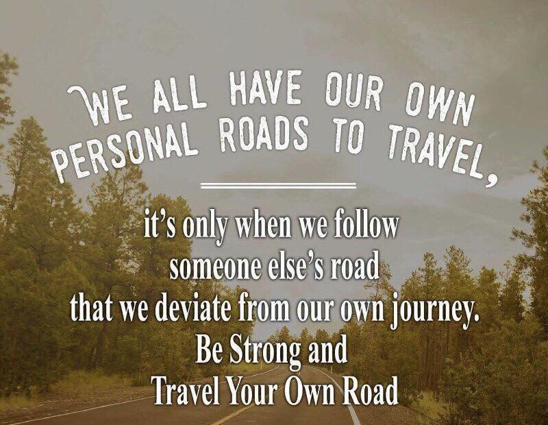 Traveling our own roads is where we find the strength to explore our personal journey's. As kids, we were taught to learn, grow, and make our own choices in life. As adults, we need to remember our childhood teachings. It's the only way to find our personal growth, happiness, and success and that's by traveling our own road.