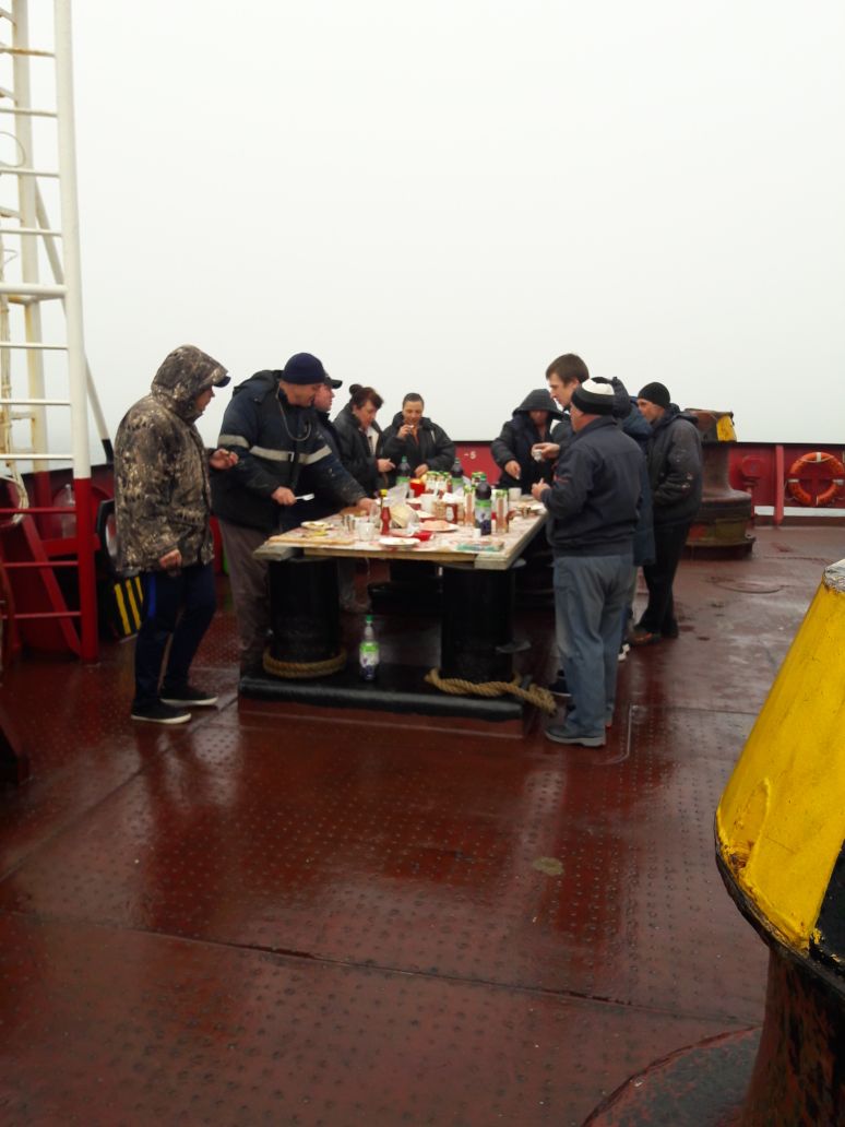 There is always plenty of down time on the ship for enjoying the benefits of your work and having a good time, this is really hard work and requires time away from the family and lots of sacrifice. Nobody is complaining that there is down time and it's time to enjoy the fresh caught lobster but will quickly clean up the deck and get back to business as usual.