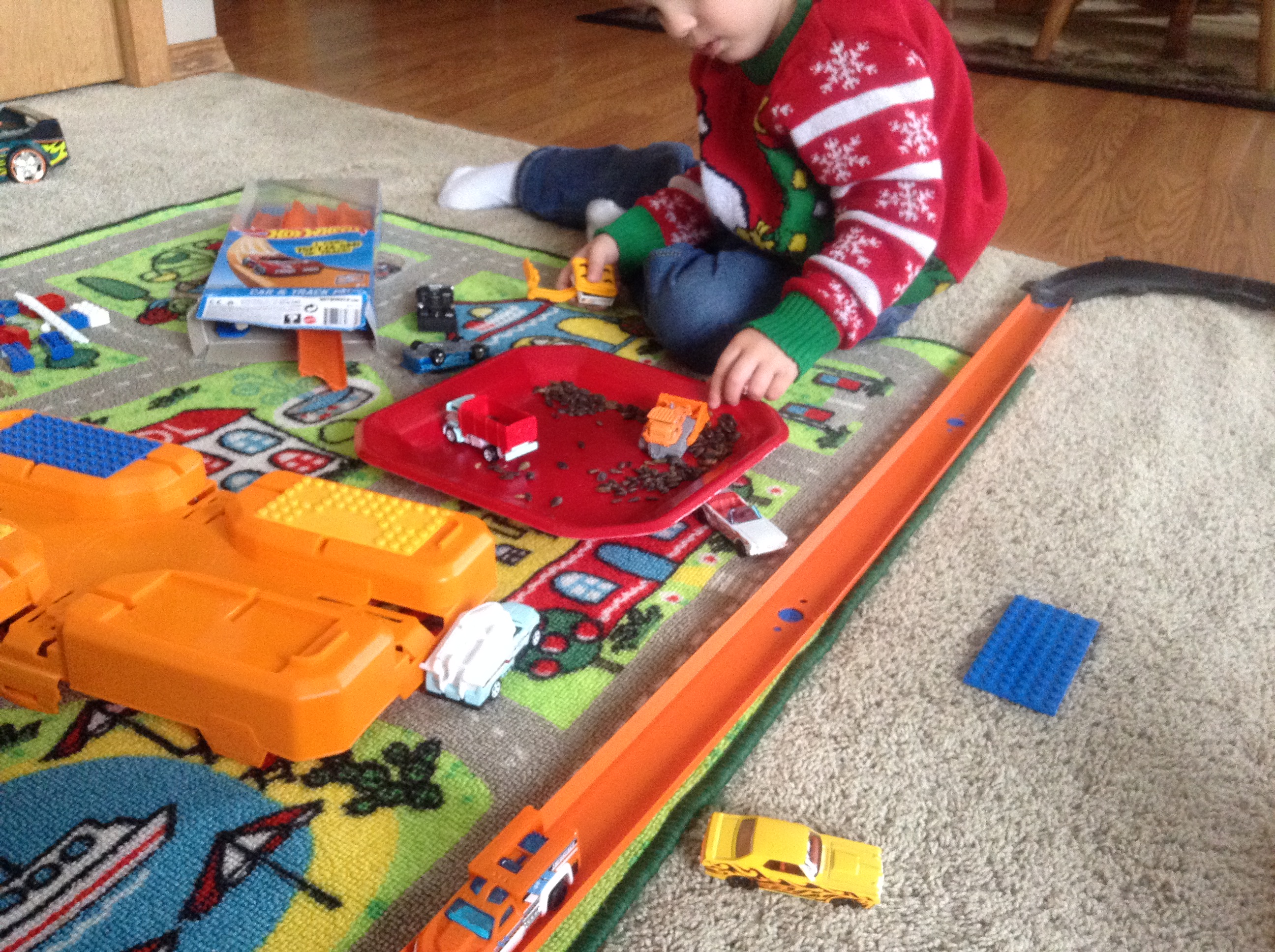 He received many Hot Wheels and Matchbox cars like a bull dozer and dump truck from me.