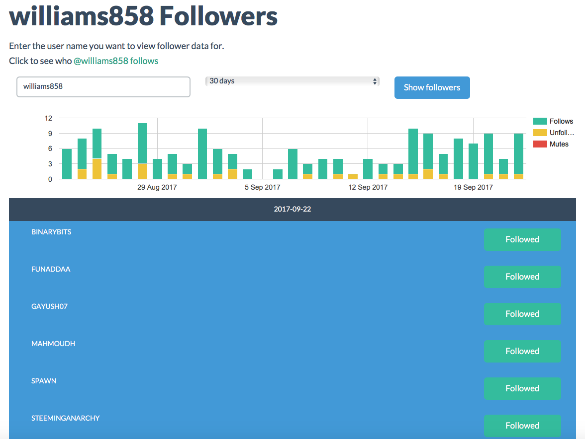 In this link you can see exactly that, its a good tool to see you performance stats as in who's followed and unfollowed you, it also lets you see who has muted you. The website was made by a dude called @shaunmza and is a useful tool to track your audience and see what days you performed best!
