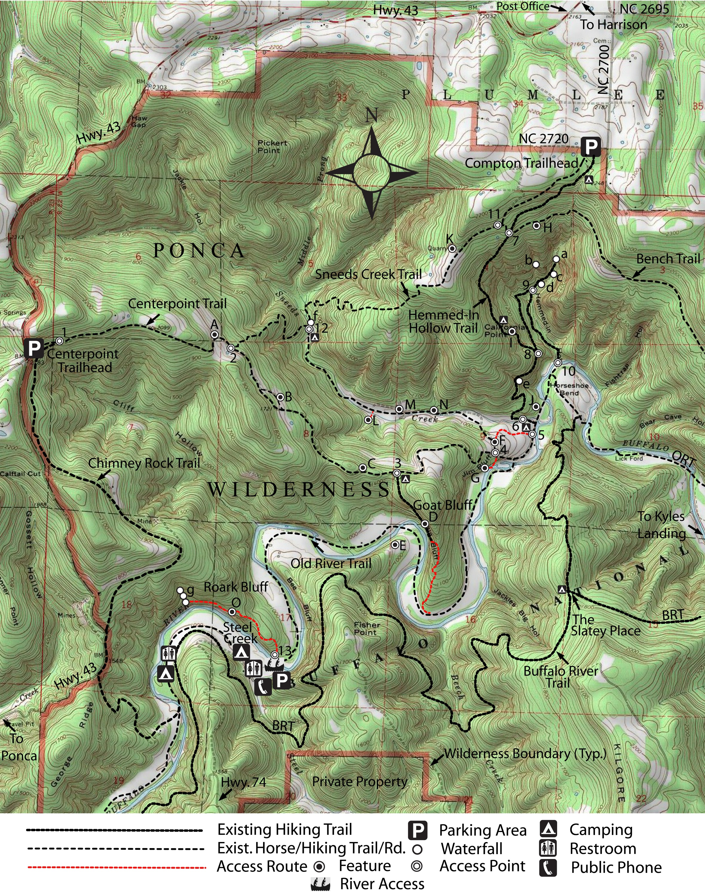 Sneed's Creek runs into the Buffalo River just up river from Hemmed in Hollow. It has a trail running a little over 4 miles all the way back up to the Compton Trail Head. The trail is amazing along the creek, especially after a rain. Once you leave the creek and start climbing elevation it gets brutal. Say goodbye to your legs.
