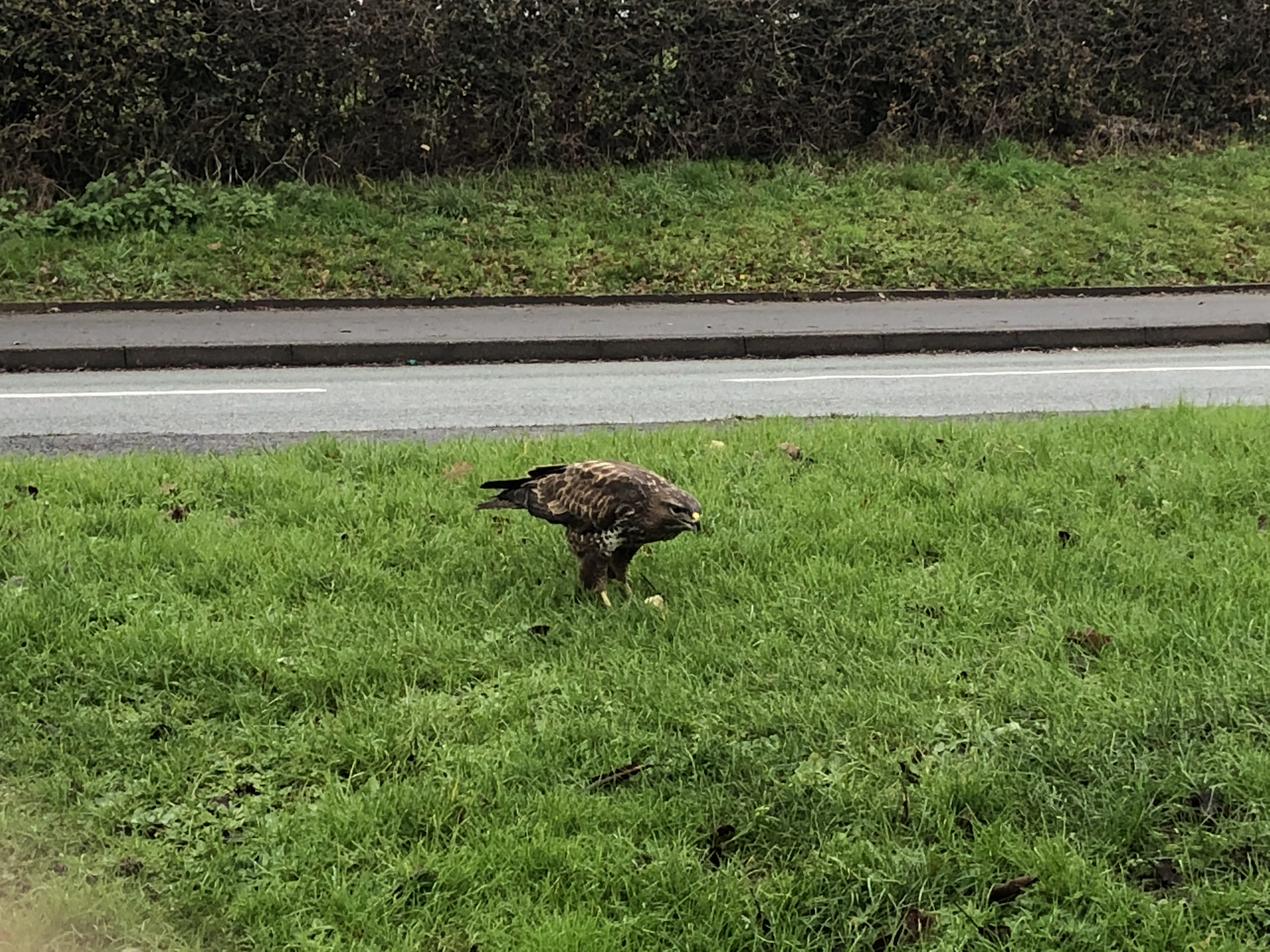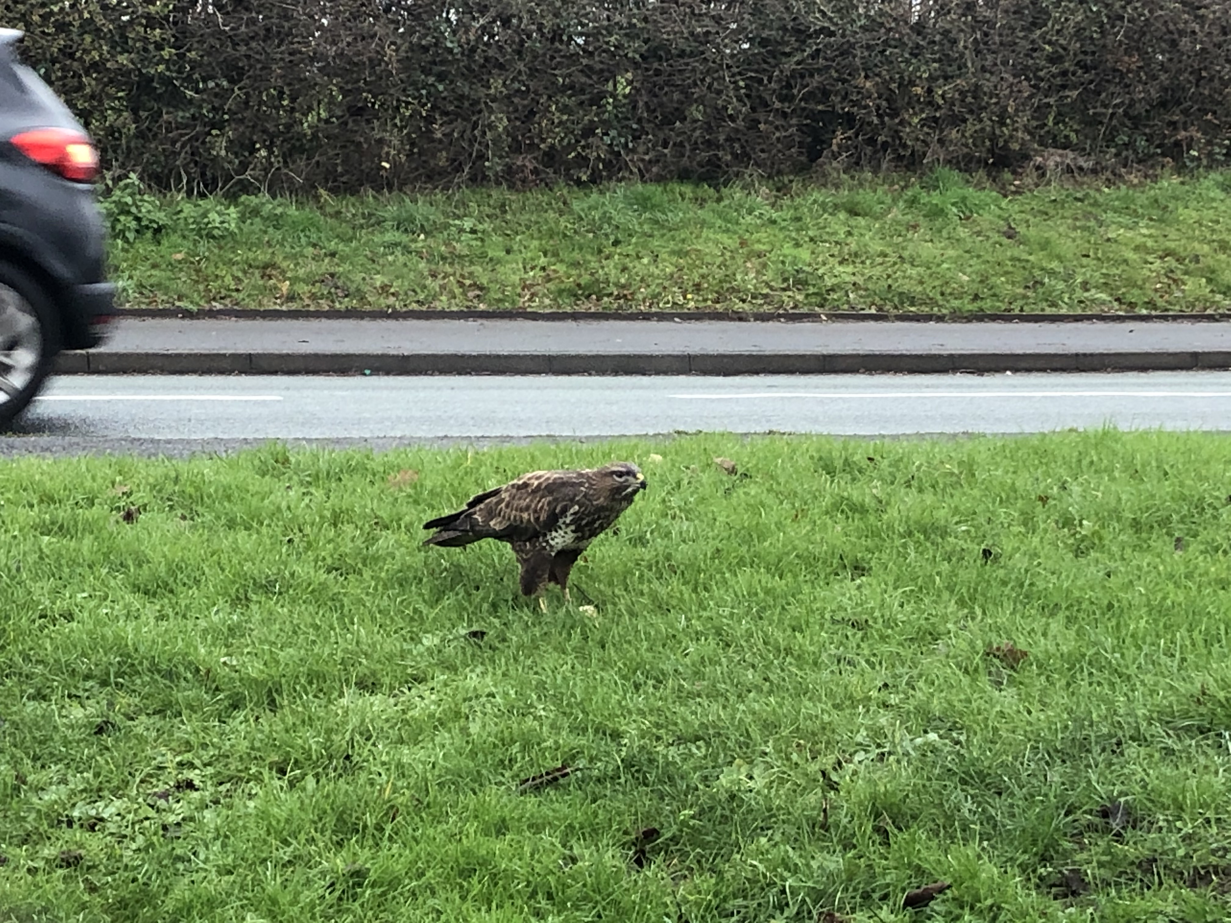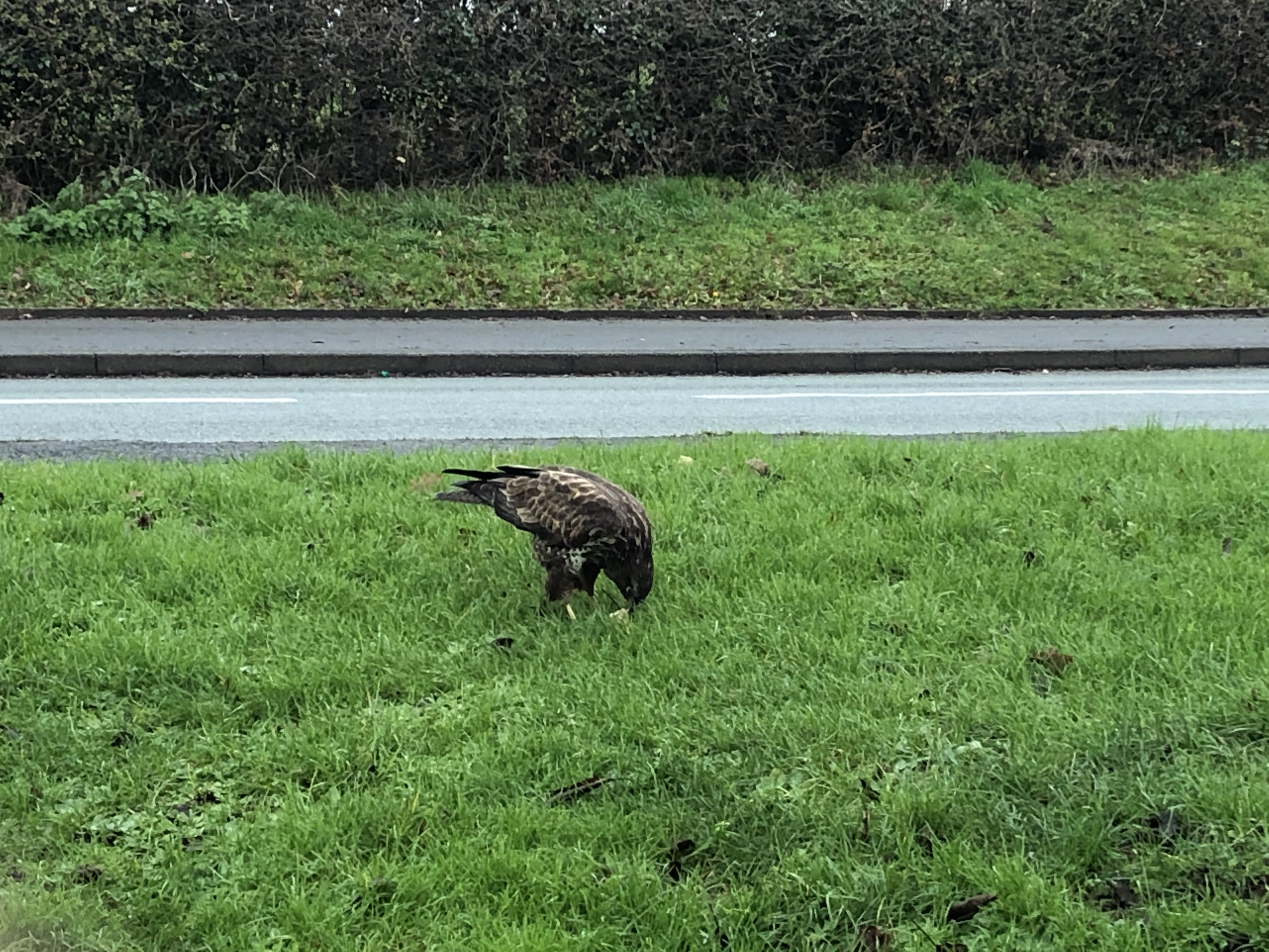 This elusive predator is often only seen circling high above the fields and forests, not sat by the side of a busy road eating cheese and onion pasties.