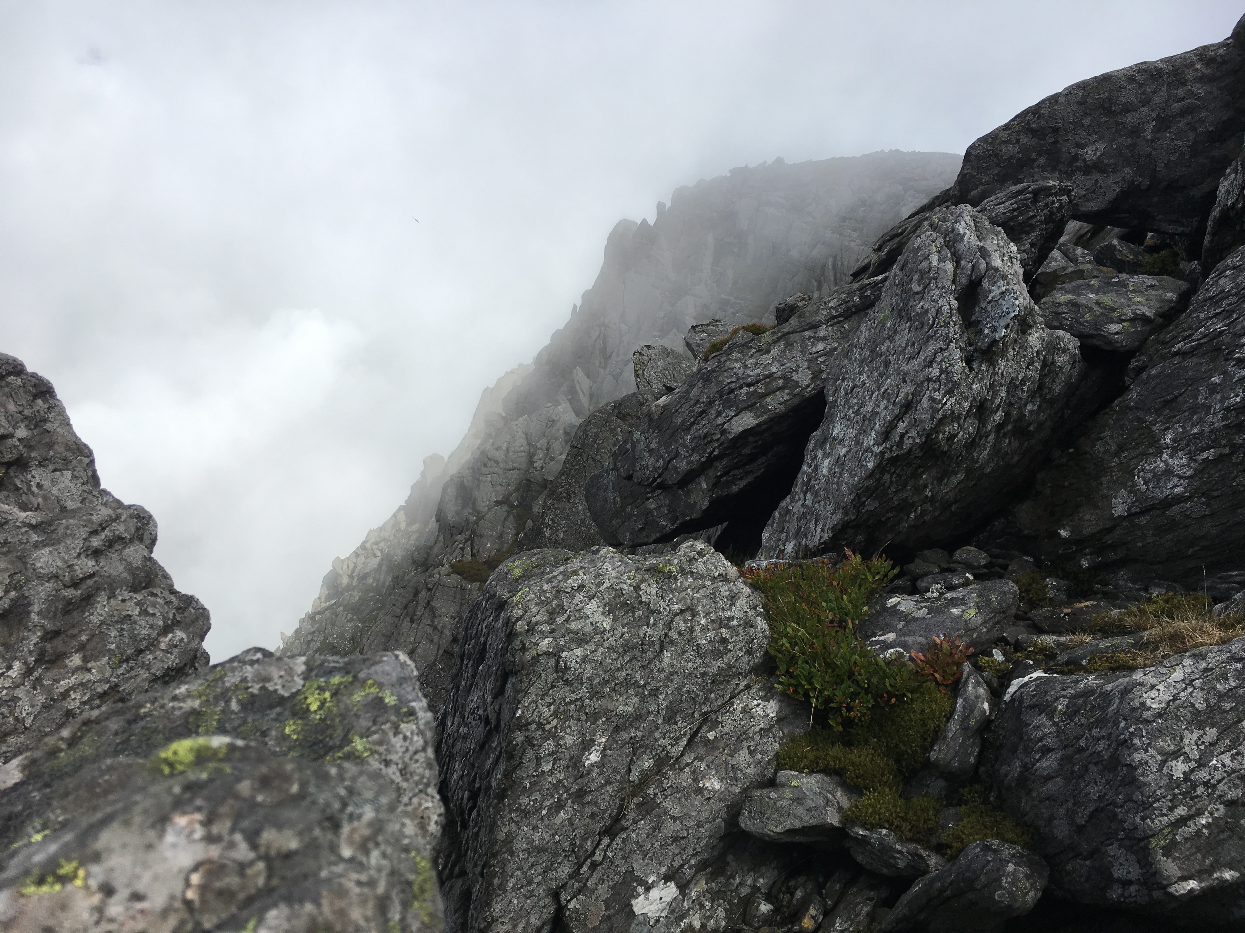 About two-thirds of the way up the weather began to change as we entered the clouds. The wind picked up and a blanket of fine British drizzle swept across the jagged rocks between us and the summit.