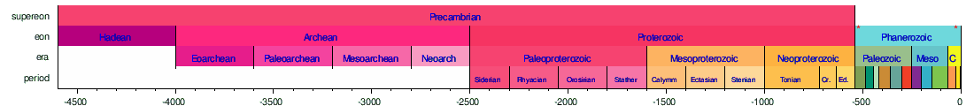The primary defined divisions of time are eons, in sequence the Hadean, the Archean, the Proterozoic and the Phanerozoic. The first three of these can be referred to collectively as the Precambrian supereon. Eons are divided into eras, which are in turn divided into periods, epochs and ages.