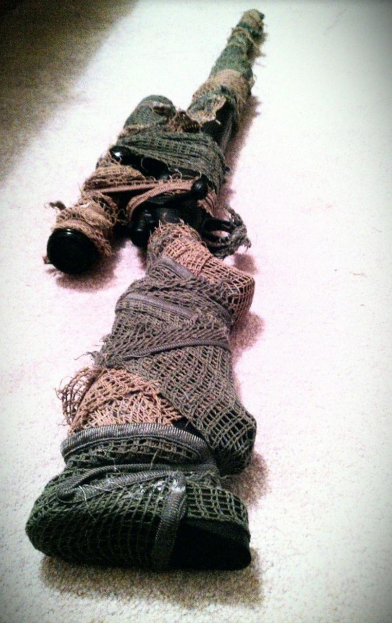 The second reason is to break up the rifle pattern or silhouette. Rifles have a lot of straight lines that go against nature. The human eye is able to form patterns quickly and can select objects that are known unconsciously. The human eye is very good at choosing black and straight lines because it is not natural. This will draw their (enemy) attention to where the army is very quickly. Breaking known patterns helps "snipers" hide/stalk more effectively.