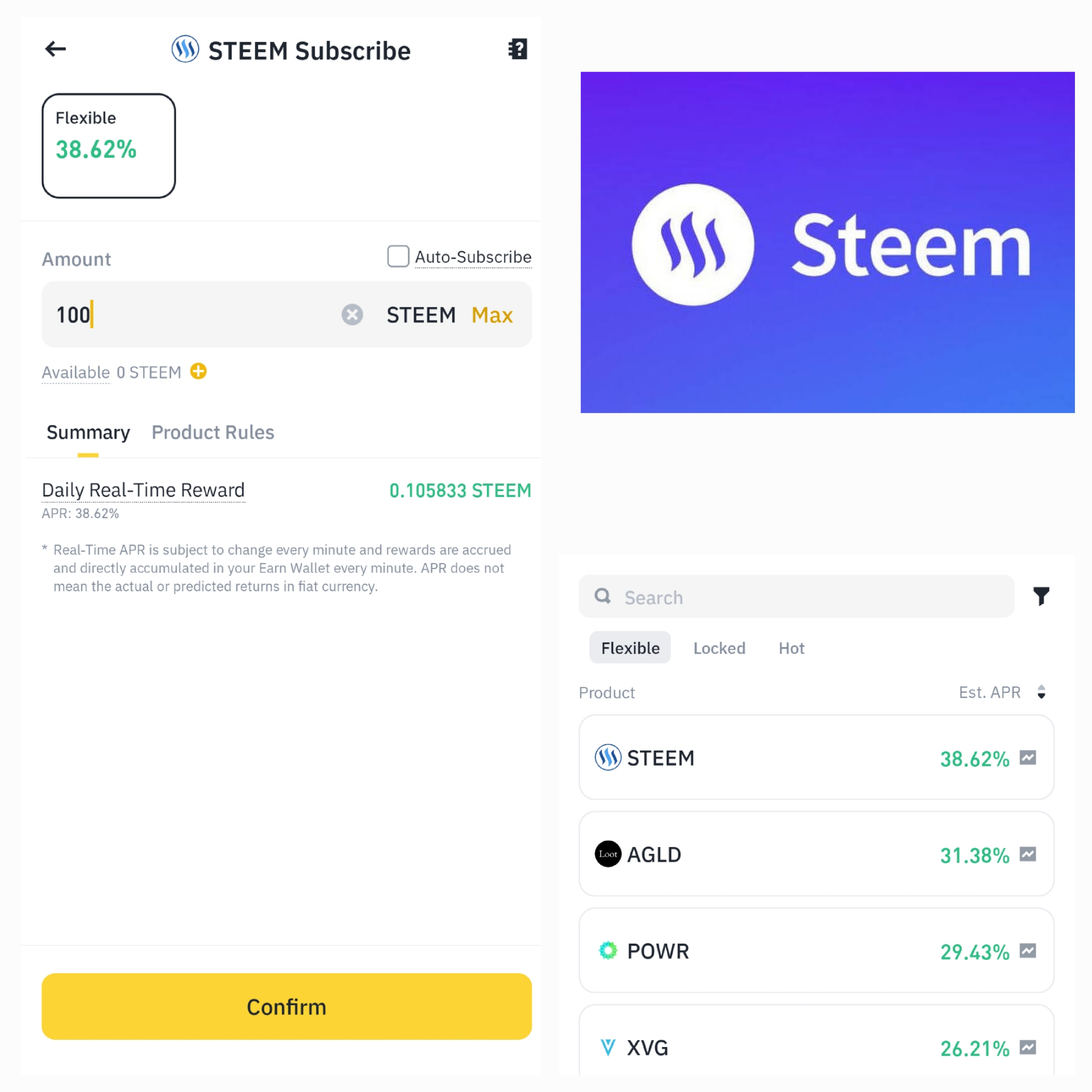 Binance + steem subscribe real time APR 38.62% NOW