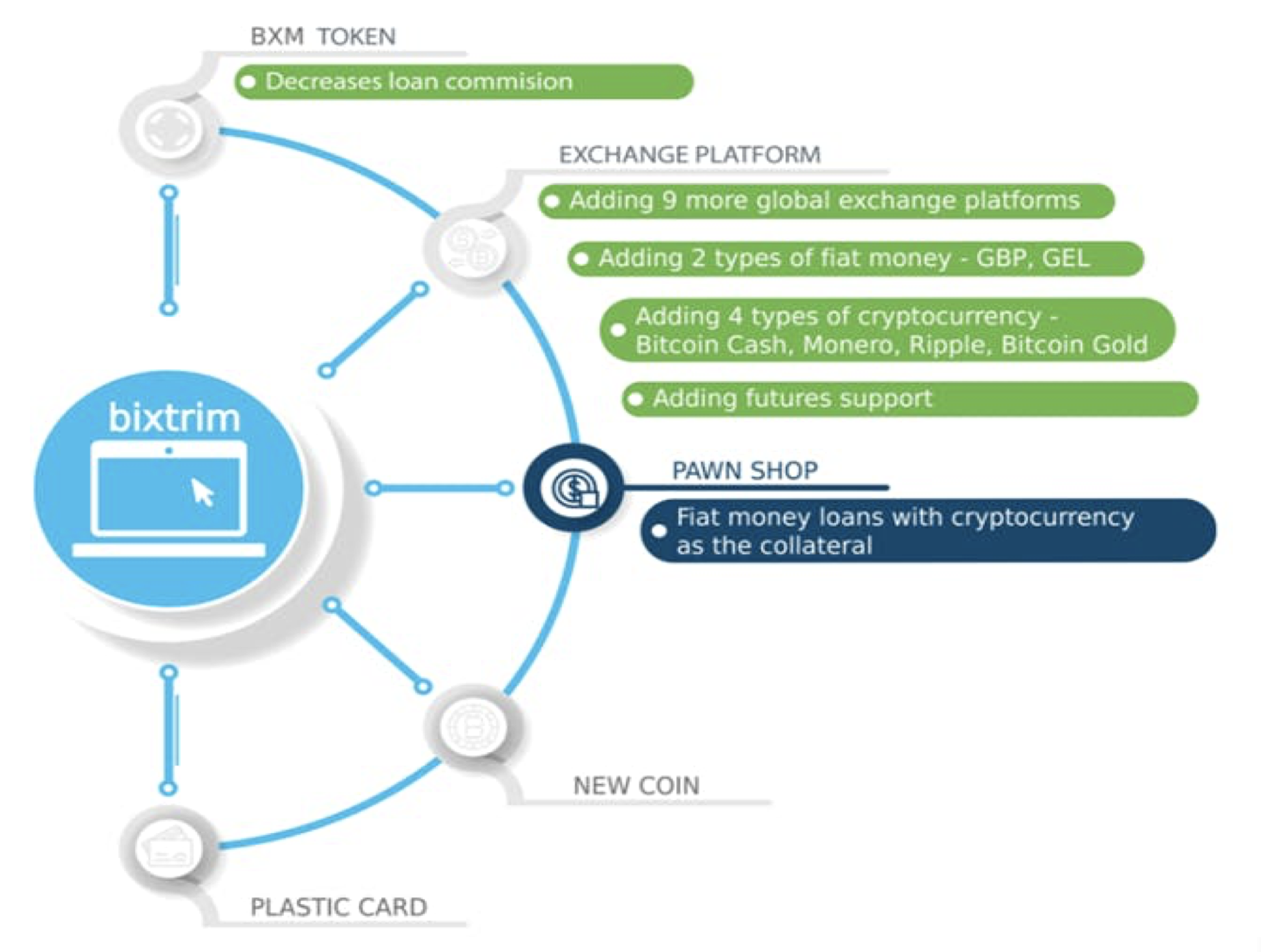 Cryptocurrency exchange; Bixtrim is able to develop a crypto pawn search where the owners of coin will pawn them for an amount of client’s time and acquire them back once paying off the commitment. This chance offers customers an opportunity to keep coins, furthermore as get the required money for a short-term and profit during a long term. Imagine a client that has one coin that is value $ 10.0K today. they have further appliances to figure out the extra cryptocurrency, in order that they plan to pawn the coin for eightieth of its value, i.e. $8.0K. They use cash to expand mining, earn cash and once a month pays off the pawn for $8.4K. By now, the value of coin has up to $20.0K. If they exchange the coin into money they'll get $9.6K take advantage of the transaction. Please note, that actual rates might vary.