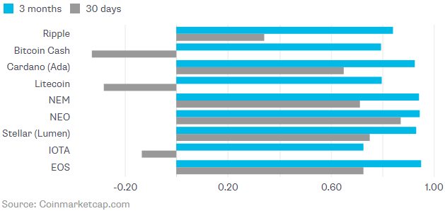 En los últimos 30 días, las monedas lanzadas por los competidores de Ethereum mostraron las correlaciones de precios más fuertes con Ether, la moneda de Ethereum. Y no se han movido al unísono con Bitcoin.