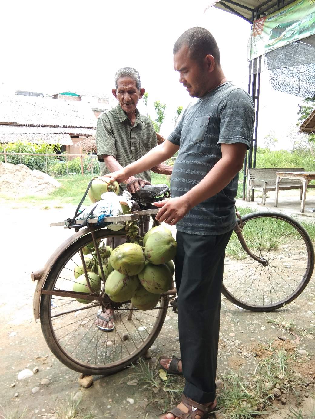 Dalam keseharian kakek ini berjualan kelapa muda hanya seputaran kota lhokseumawe dengan mendorong sepedanya memutar area kota lhokseumawe, walaupun sepada kakek ini terlihat tua namun masih sanggup menahan beban hingga enam tandan kelapa muda. Apa lagi kalau kita melihat raut wajah kakek ini yang sudah tua yang usianya sekian puluh tahun yang tidak pernah kita bayangkan begitu kuat kakek ini medorong Sepedanya mengelilingi kota lhokseumawe untuk berjualan.