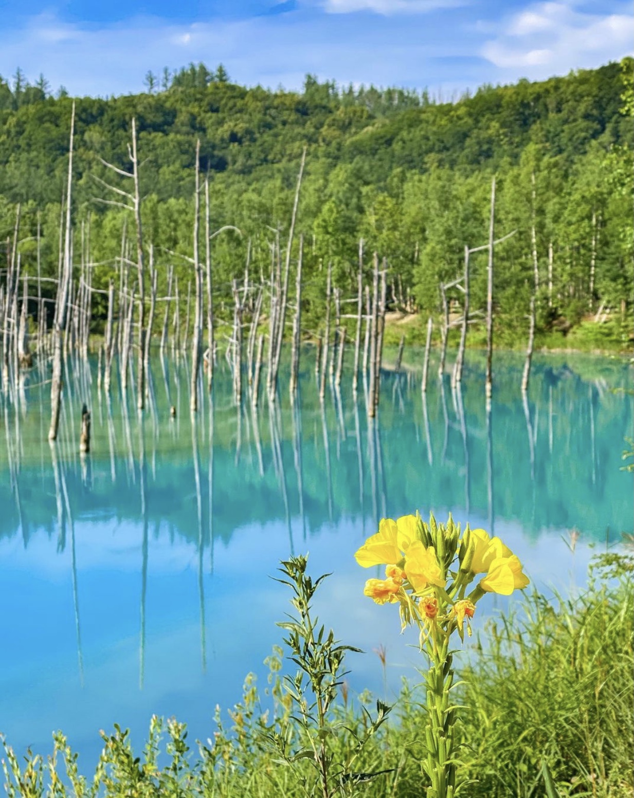 홋카이도 비 에이 초의 푸른 연못.원래이 연못은 1988 년에 도카치 다케 산의 분화로 인한 피해를 막기 위해 건설되었습니다.그러나 강물과 샘물이 쌓이기 시작하자 우연히 놀라운 푸른 연못이 나타났습니다.