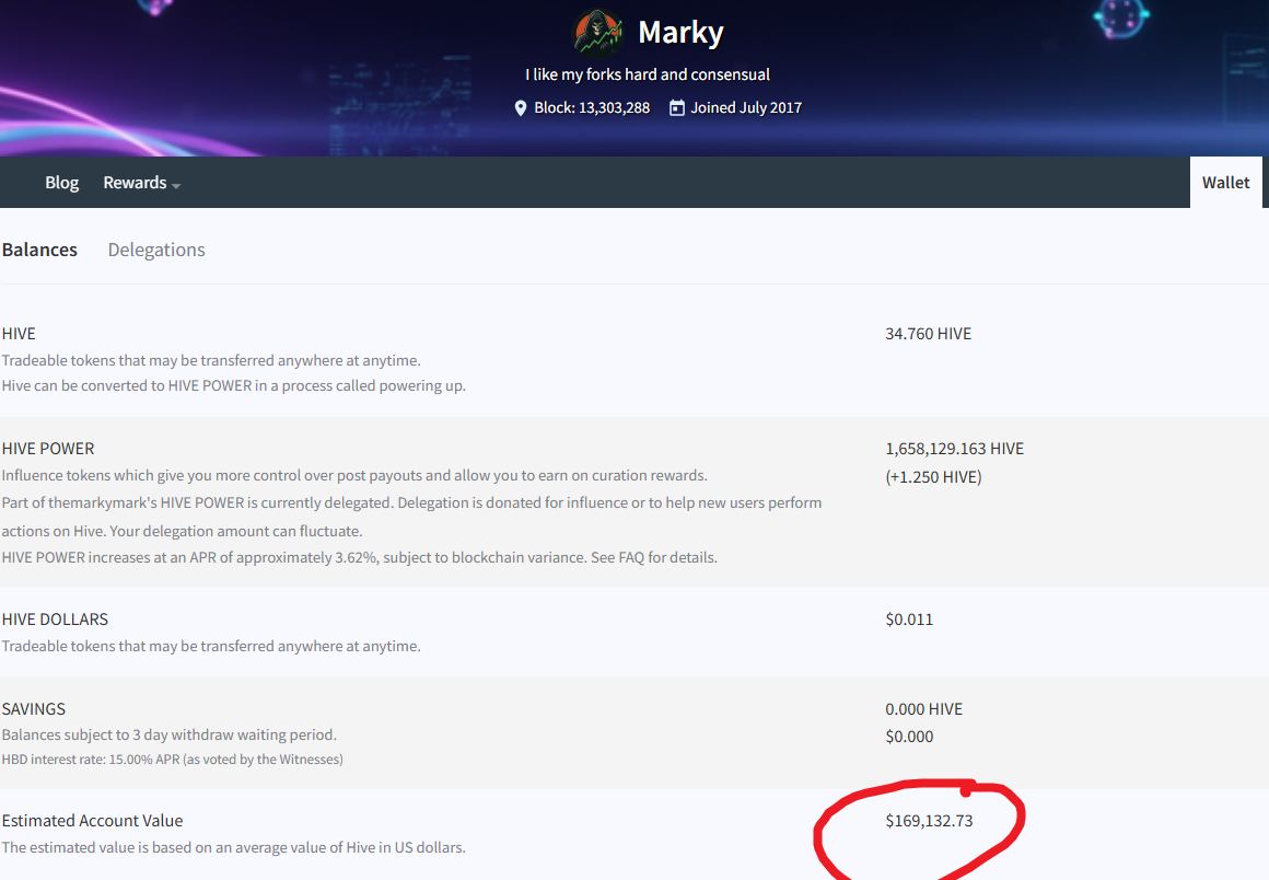 The king of the downvote cabal, MarkyMark, was a potential-multi-millionaire a few years ago. He had a million HIVE, which was worth more than $3 million for a time. He has earned a lot of HIVE through inflation and circle-jerk payouts since then, now totaling 1.6m... but check out the current value: