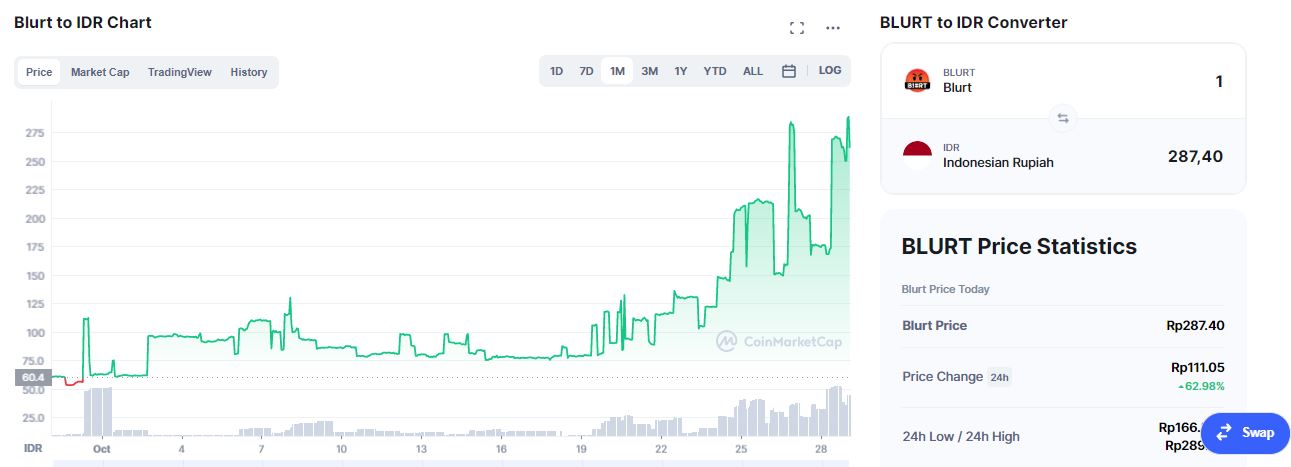 Dalam beberapa hari terakhir, token Blurt mengalami peningkatan harga yang cukup signifikan. Dari harga Rp 50-an, dan saat postingan ini saya tulis, harga Blurt Rp 287,74 per token-nya.