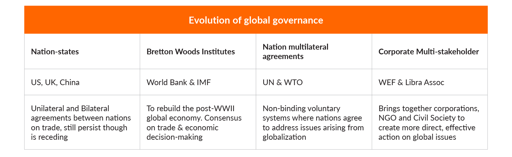 Facebook’s Libra Association has been the greatest attempt by an MNC to recreate the multi-stakeholder model in a consortium that if successful could become a ‘decentralized NGO’. However, as blockchain potentially enables new forms of decentralized organization and co-opetition between rival companies ‘decentralization’ could also be used as a veil to absolve companies from traditional liabilities, just as no one can be subpoenaed for the consequences of bitcoin or any other permissionless cryptocurrency.