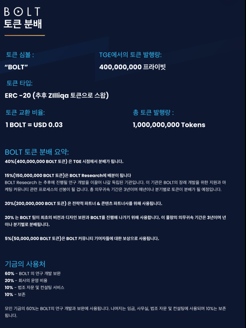 BOLT 토큰은 발행량이 10억개로 정해져 있으며, 가치는 활동량과 생태계 내의 서비스에 대한 수요에 의해 결정된다.