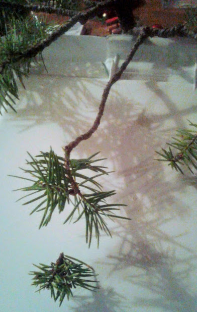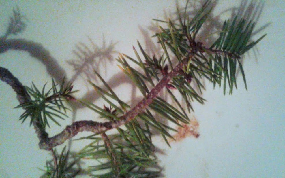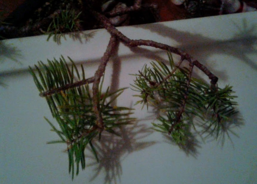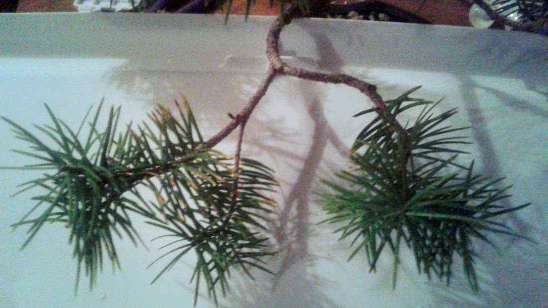The white plastic backdrop is held underneath to help display this branch separately for the camera. In reality this branch has needles that blend in with the needles of other nearby branches underneath.
