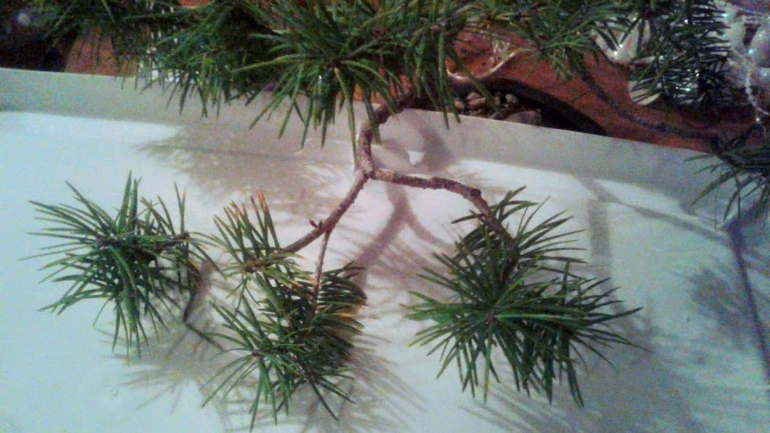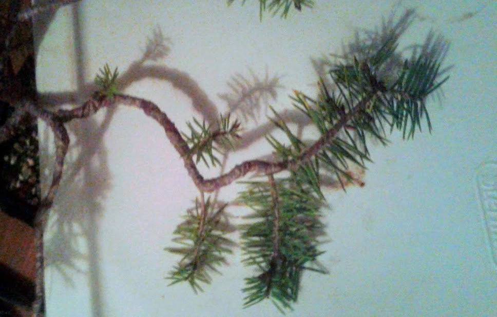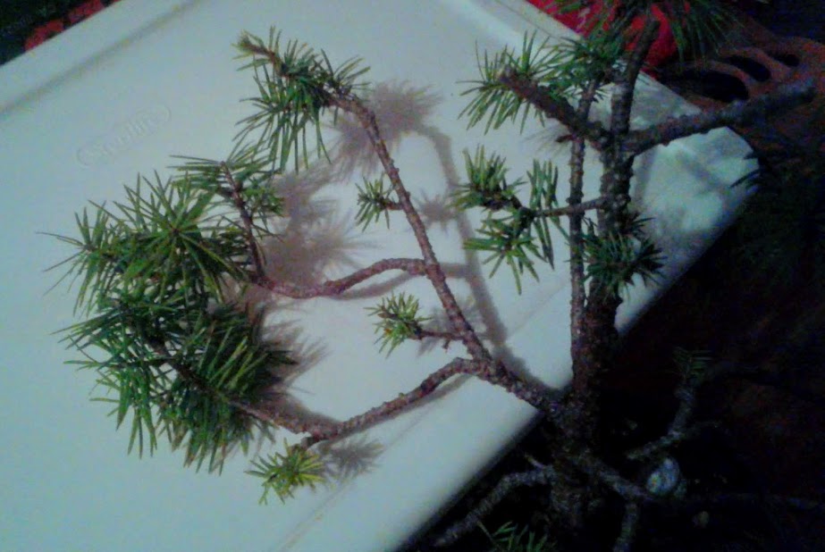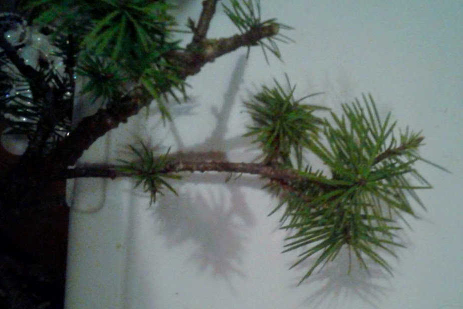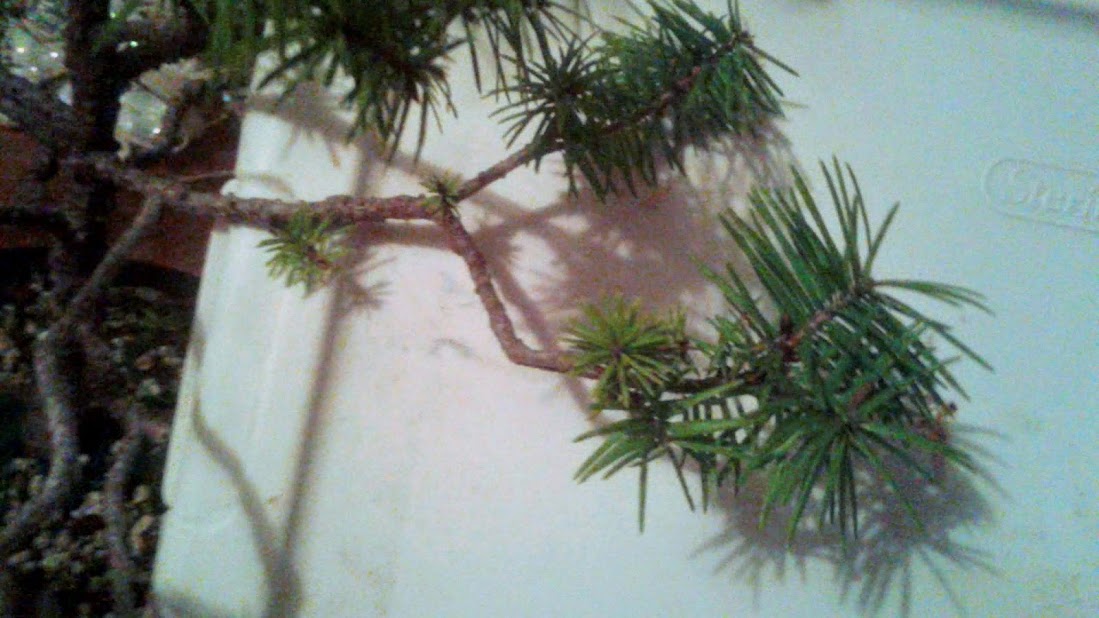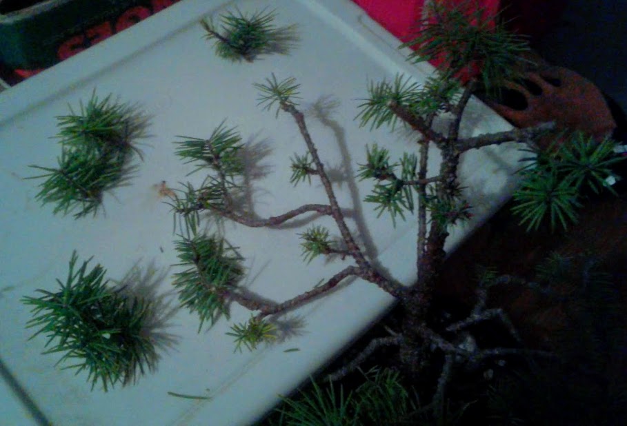 Notice the small needle size. This happens in bonsai trees when many new buds are forced to balance out a limited amount of energy.