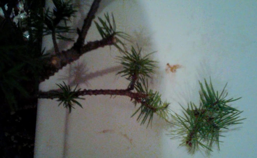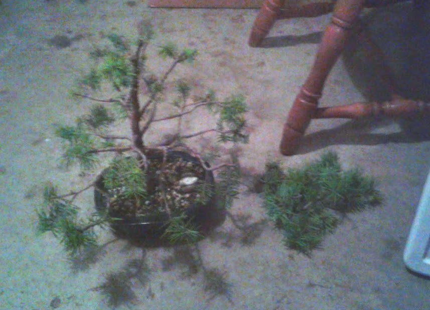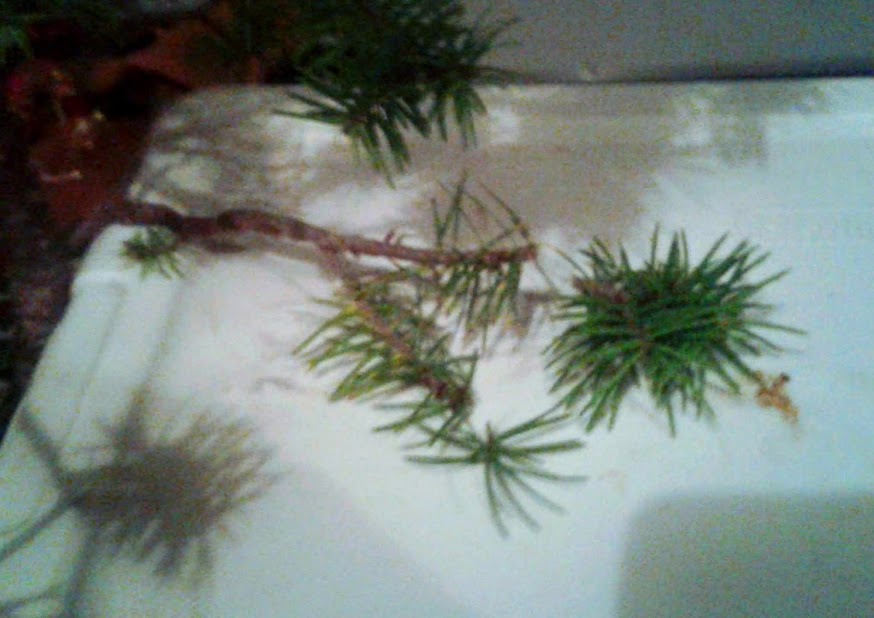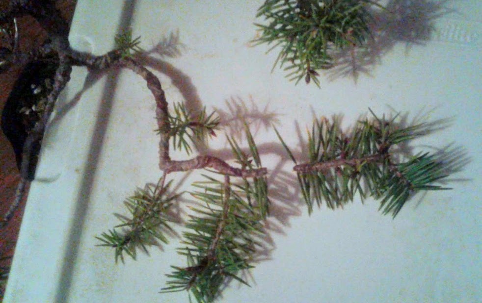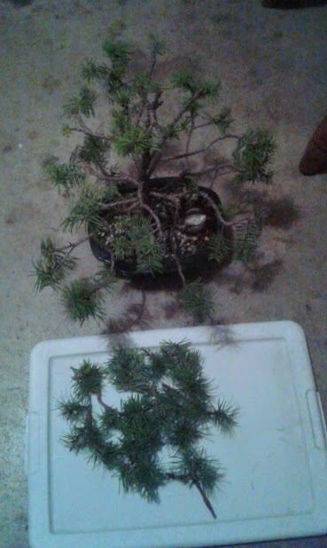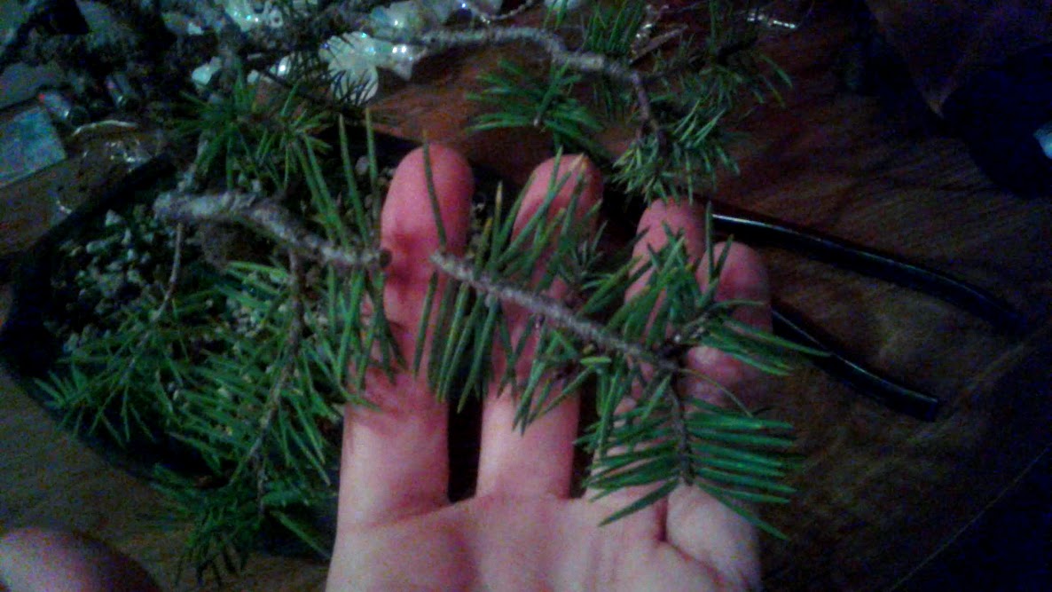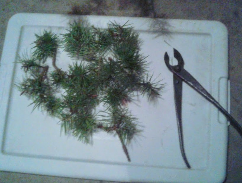 I pictured the clippings next to the tree to show that I pruned off close to 1/4 of the needles today attached to living wood.
