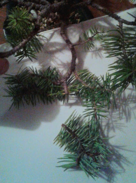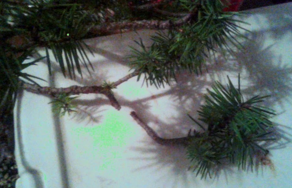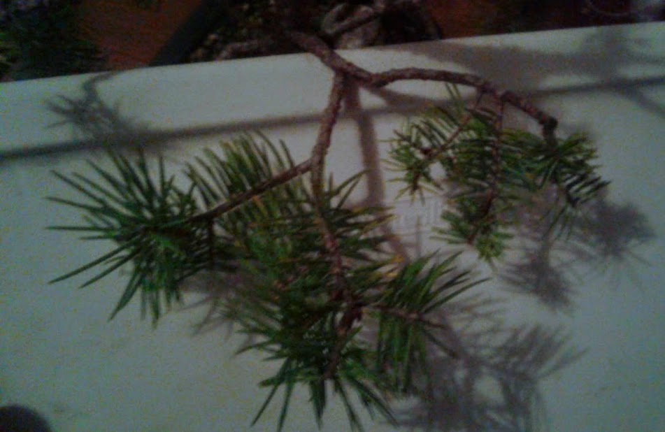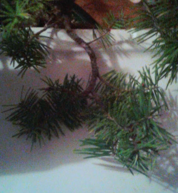 On this branch, the internode from one branch to the next is extremely far apart. It is not an appealing look on a tree to have a thick branch with nothing green on it, and end in a small puff ball cluster. Sometimes topiary is designed this way on purpose, but not a good look for a bonsai Christmas tree.