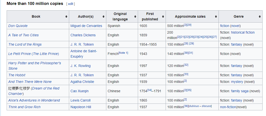 When I was looking through the best selling individual books Wikipedia page I was extremely surprised to see Don Quixote as the number one book(when excluding the Bible and Koran) with 500 Million Copies sold.