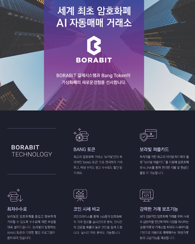 한편 보라빛 거래소는 세계 최초 AI 자동매매라는 시스템을 장착한 국내 거래소로 고객 중심의 각종서드파티로 유저의 자산을 늘려주는 시스템이 핵심인 거래소다.