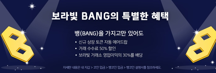 현재 보라빛 거래소 홈페이지에는 급등 코인을 찾아주는 기능의 보라캐치가 누구에게나 무료로 제공되고 있으며 그 외 자체 코인인 뱅을 구매한 사람들에게 영업 이익의 30%를 지급하고 홀드된 뱅을 소지한 고객들에게 신규 상장되는 코인을 에어드랍 해주는 파격적인 시스템으로 주목받고 있다.