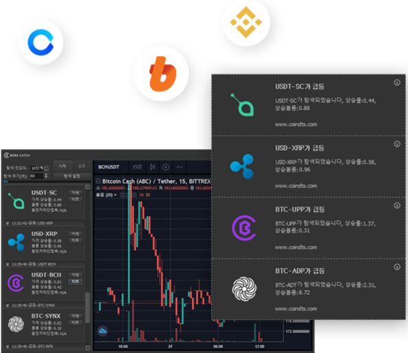 현재 160여종의 암호화폐의 실시간 급등 정보를 활용할 수 있고 1단계에서 10단계까지 민감도를 체크해 알림 서비스를 받을 수 있다. 급등이 포착된 암호화폐를 쉽고 간단하게 매매할 수 있는 다양한 보조지표 차트도 지원한다.