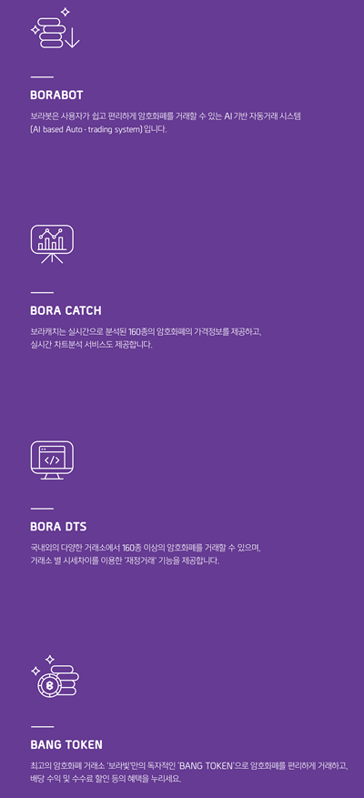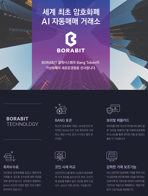 보라빛거래소가 바로 유저에게 찾아가는 서비스를 제공하는 거래소다. 보조지표를 몰라도.. 전문 트레이더가 아니어도. 차트를 몰라도 AI가 스스로 알아서 매매해주는 거래소. 보라빛 거래소가 다른 거래소들과 확연하게 차별이 될 수밖에 없는 이유다.