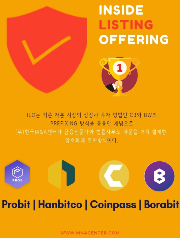 ILO(Inside Listing Offering)는 기존 자본 시장의 상장사 투자 방법인 CB(Convertible Bond)와 BW(Bond with Warrant)의 Refixing(가격 재조정) 방식을 응용해 시장에 맞게 적용한 개념으로 한국M&A센터(대표 유석호,http://www.mnacenter.com)가 유수의 금융전문가와 법률사무소 자문을 거쳐 설계한 암호 화폐 투자방식이다.