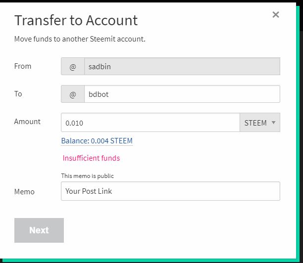 Just send 0.010 sbs/steem to bdbot with your post link in memo from your wallet.