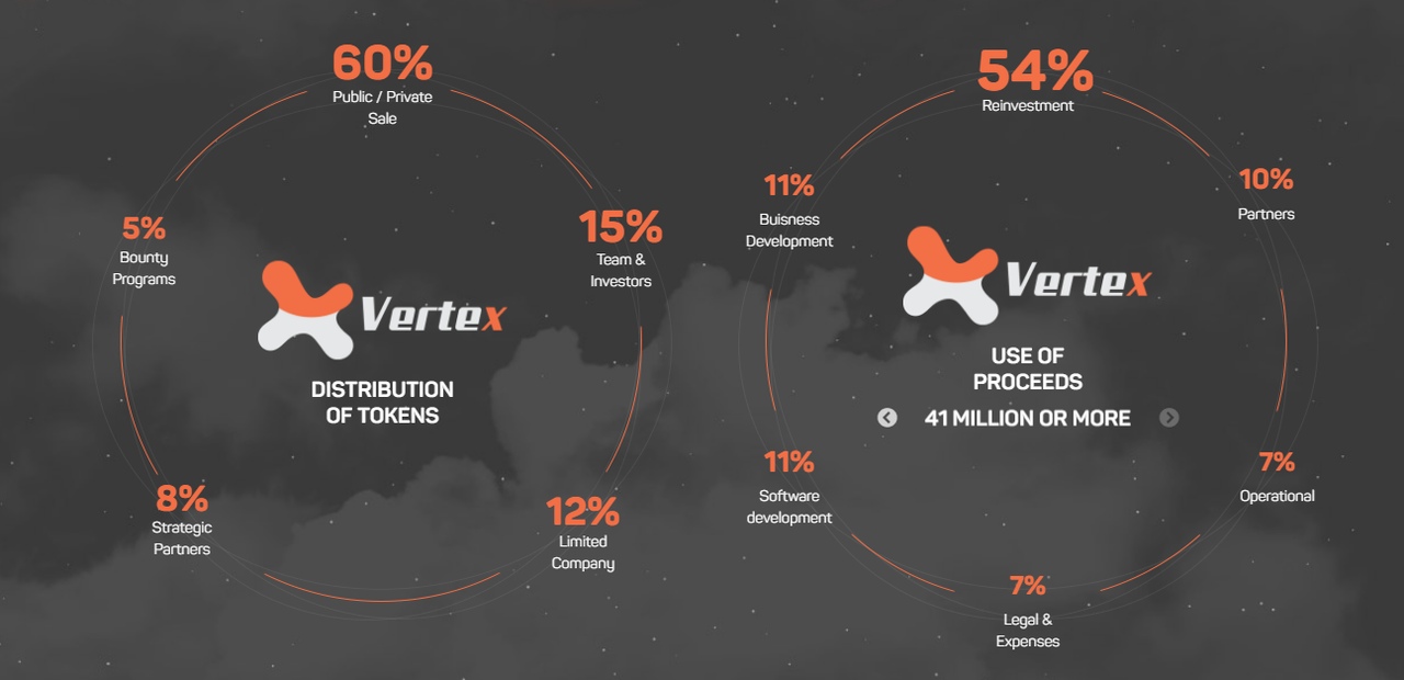Vertex Market platform is planned to be used instead of tokens such as Eth, Btc, Dash to invest in ico.A total of up to 300 million will be produced, of which about 60% (180 million) are planned to be sold.