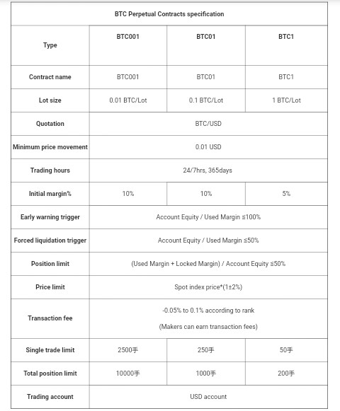 There are 6 types of Perpetual Contracts, i.e.BTC001、BTC01、BTC1、ETH001、ETH1、ETH10 based on two of the most popular cryptocurrencies in the market. Reference currency and profit/loss calculation will be based on USD.